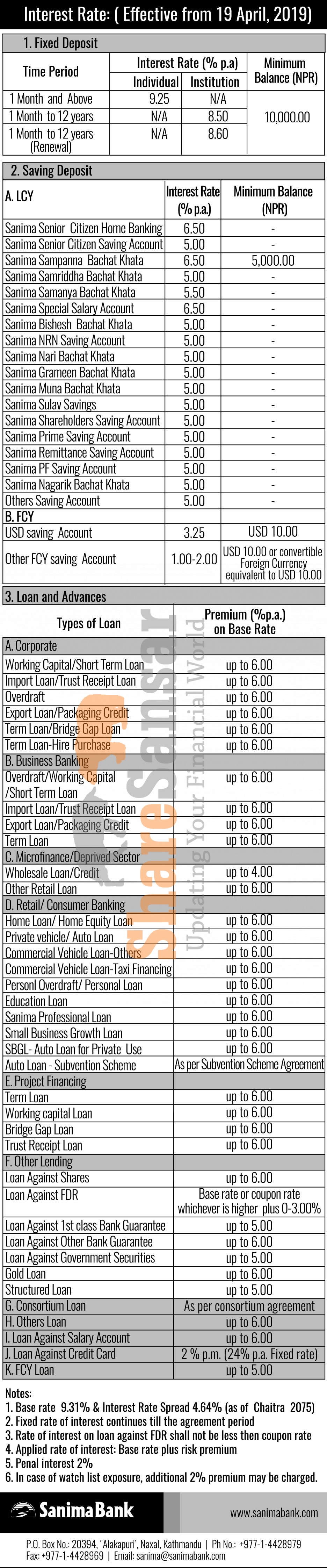 Sanima Bank Limited has published a notice regarding new interest rate and its effective from 6th Baishakh, 2076.