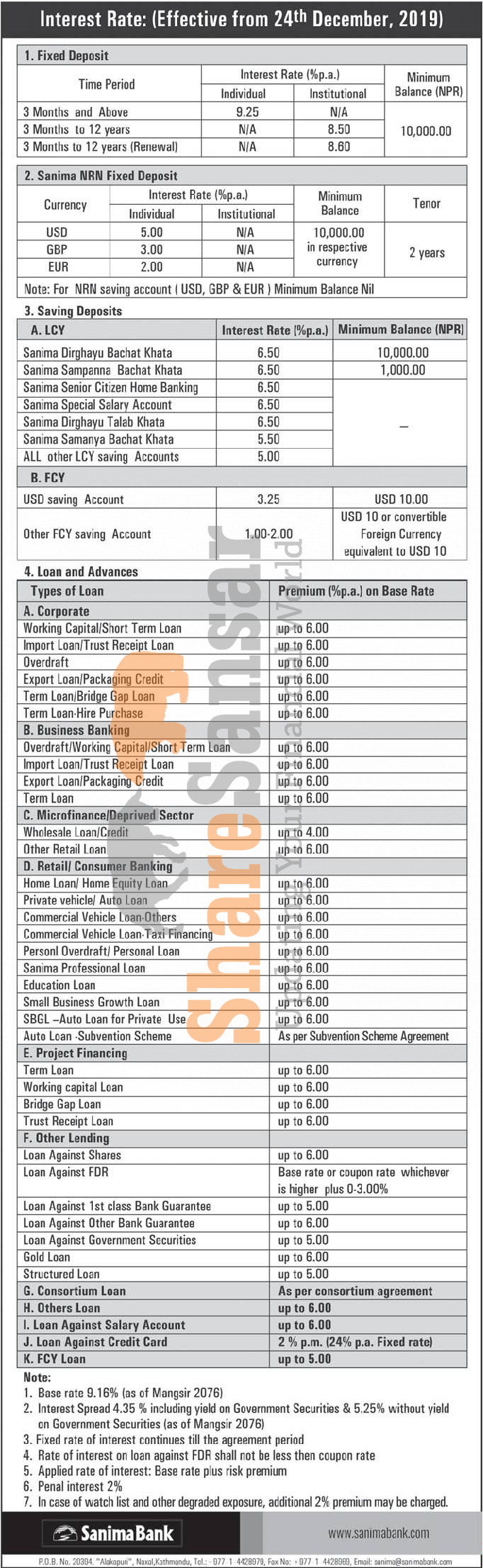 Sanima Bank Limited has published a notice regarding new interest rate and its effective from 8th Poush, 2076.