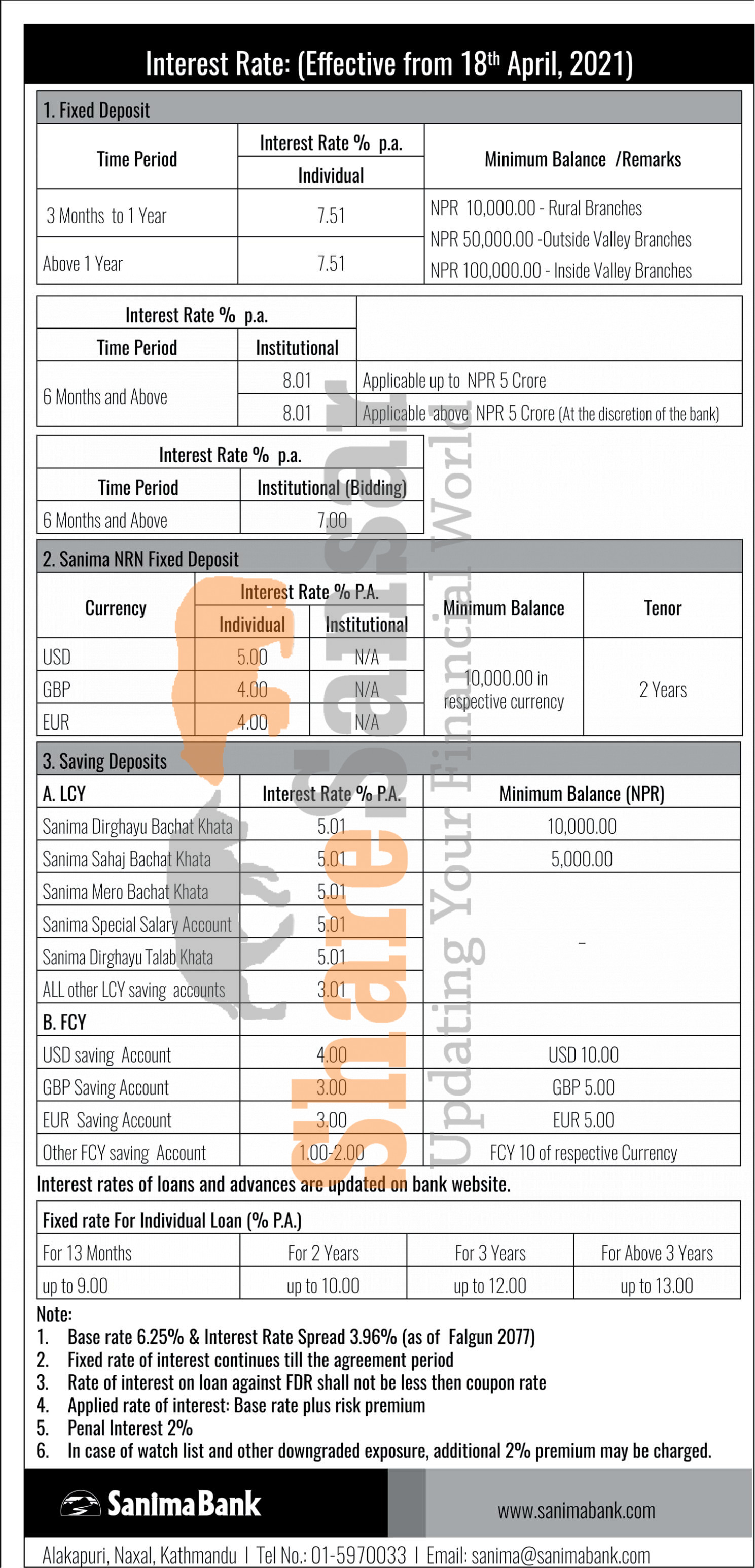 Sanima Bank Limited has published a notice regarding the new interest rate for deposit and loan products and it's effective from 1st Baisakh, 2078.