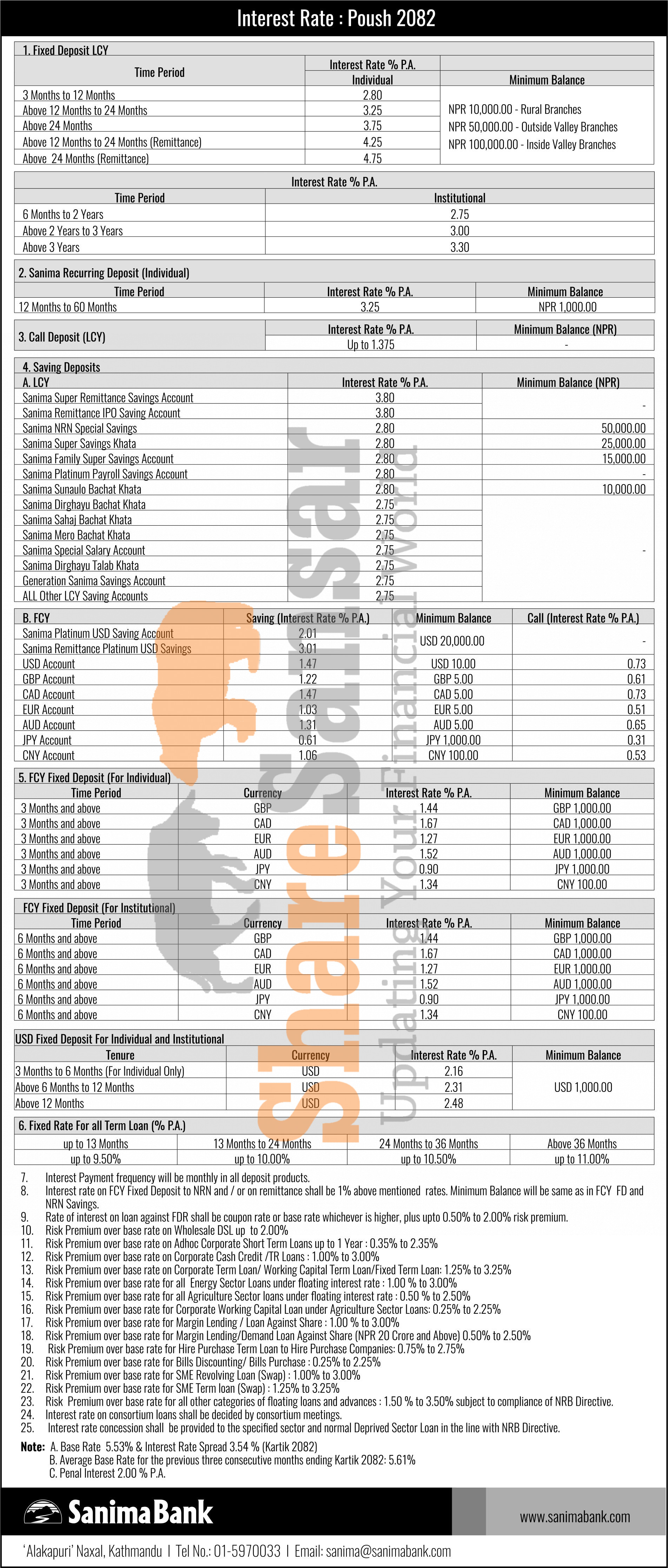 Sanima Bank Limited has published a notice regarding the new interest rate for deposit and loan products and it's effective from 1st Poush, 2082.