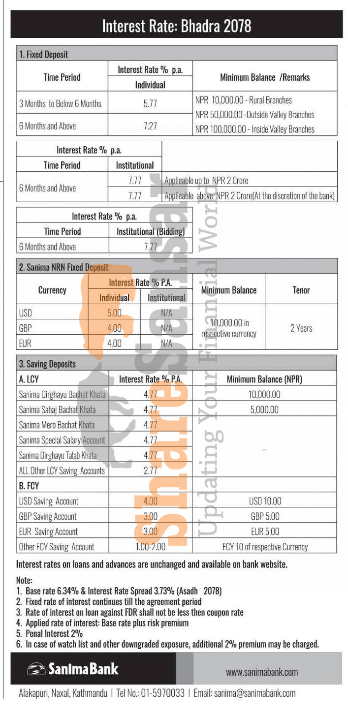 Sanima Bank Limited has published a notice regarding the new interest rate for deposit products and it's effective from 1st Bhadra, 2078.