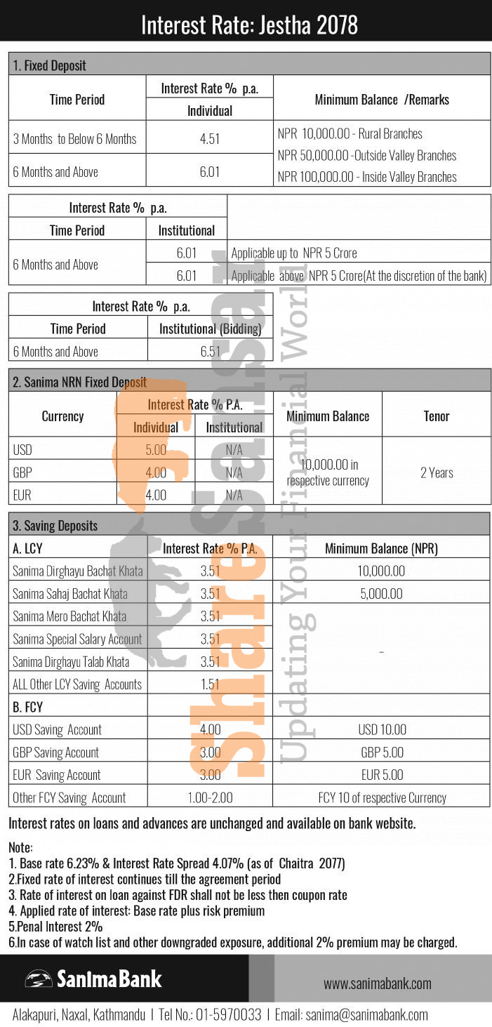 Sanima Bank Limited has published a notice regarding the new interest rate for deposit products and it's effective from 1st Jestha, 2078.