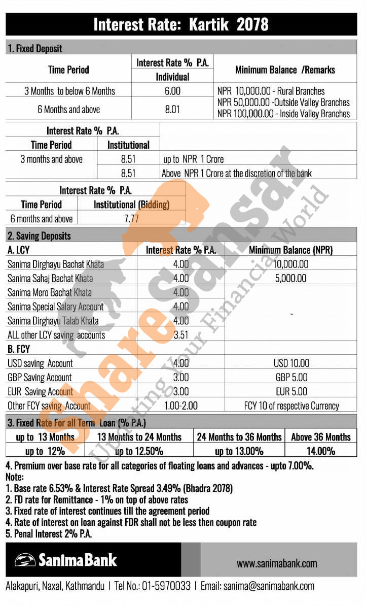 Sanima Bank Limited has published a notice regarding the new interest rate for deposit and loan products and it's effective from 1st Kartik, 2078.