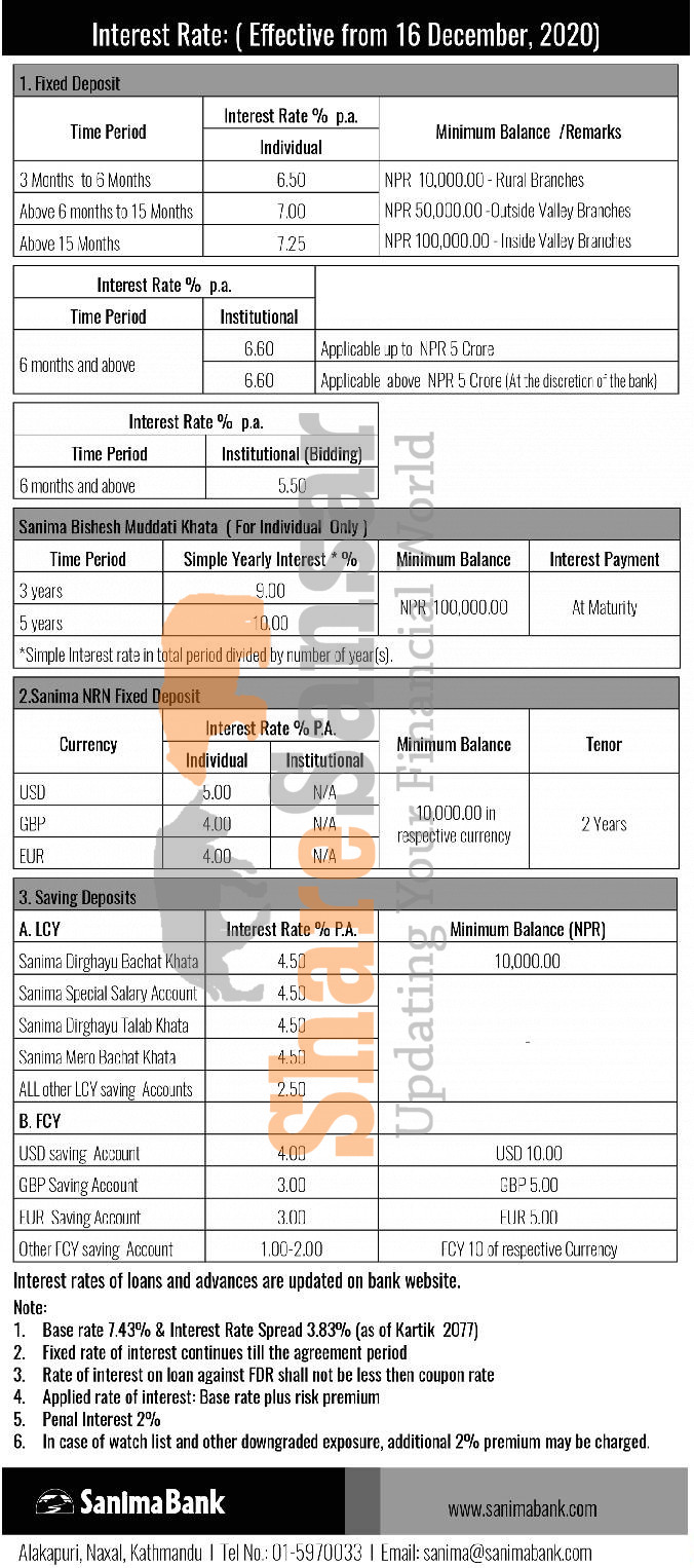 Sanima Bank Limited has published a notice regarding the new interest rate for its deposit products and it's effective from 1st Poush, 2077.
