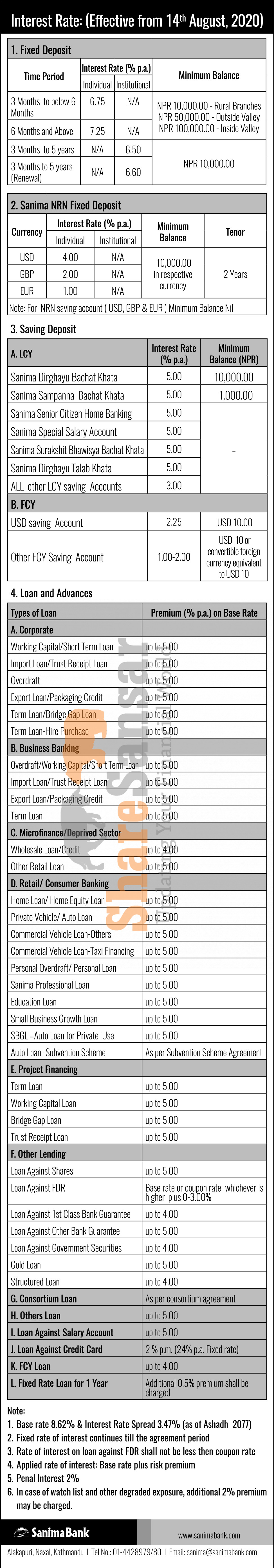 Sanima Bank Limited has published a notice regarding the new interest rate for its deposit and loan products and its effective from 30th Shrawan, 2077.