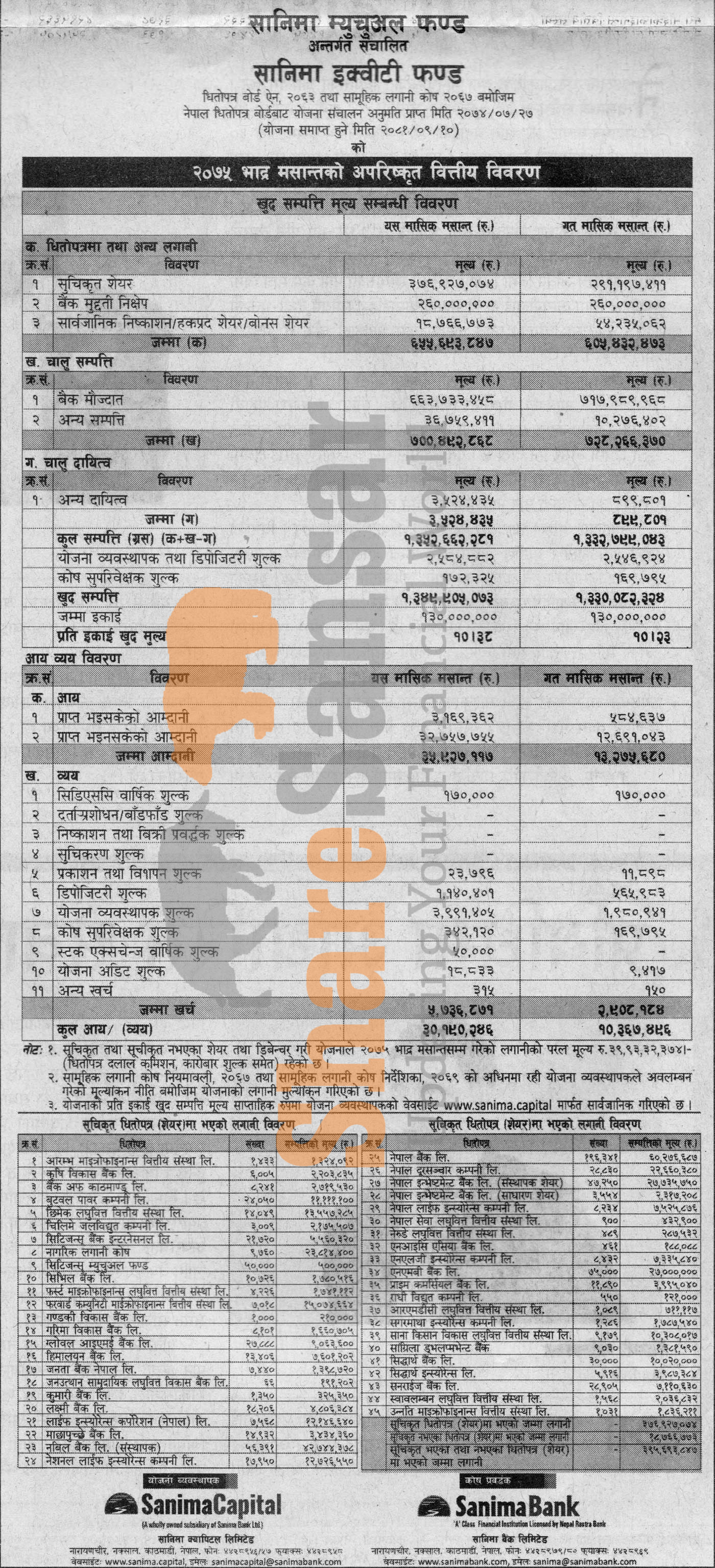 Sanima Capital Limited has published “Sanima Equity Fund” Net Asset Value (NAV) till Bhadra, 2075.