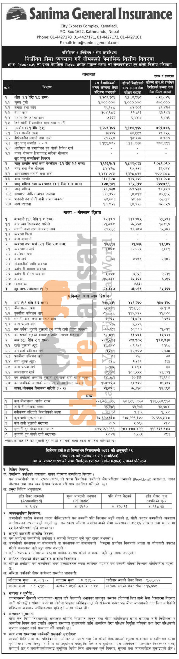 Sanima General Insurance Limited has posted a net profit of Rs 24.34 million and published its 1st quarter company analysis of the fiscal year 2078/79.