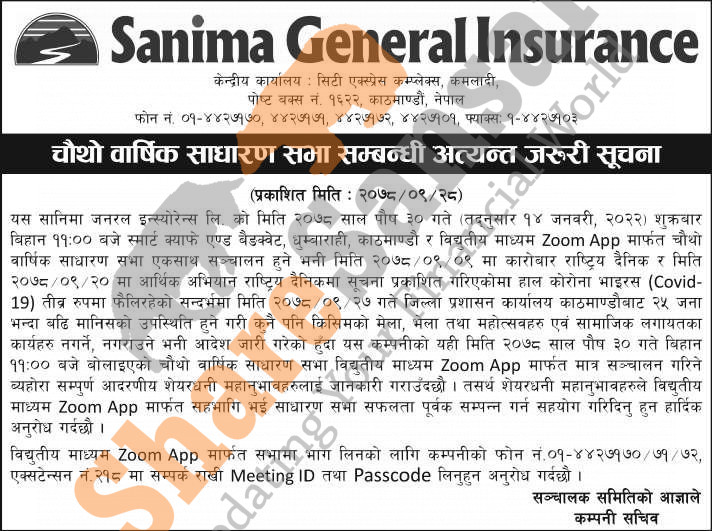 Sanima General Insurance Limited has published a notice regarding its upcoming 4th AGM to be conducted through virtual medium.
