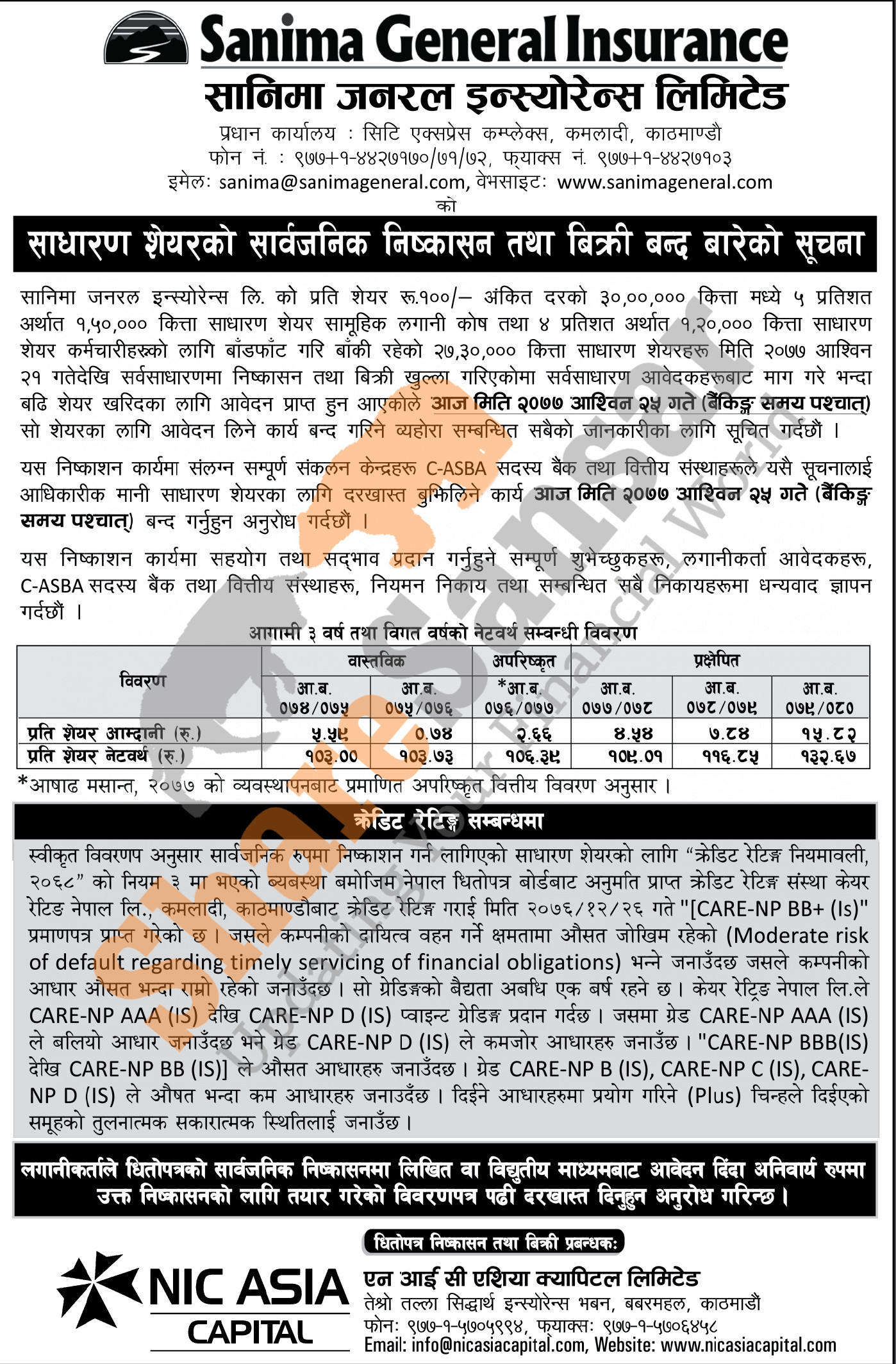 Sanima General Insurance Limited is closing its 30,00,000 units IPO shares to the general public from today (25th Ashoj, 2077).