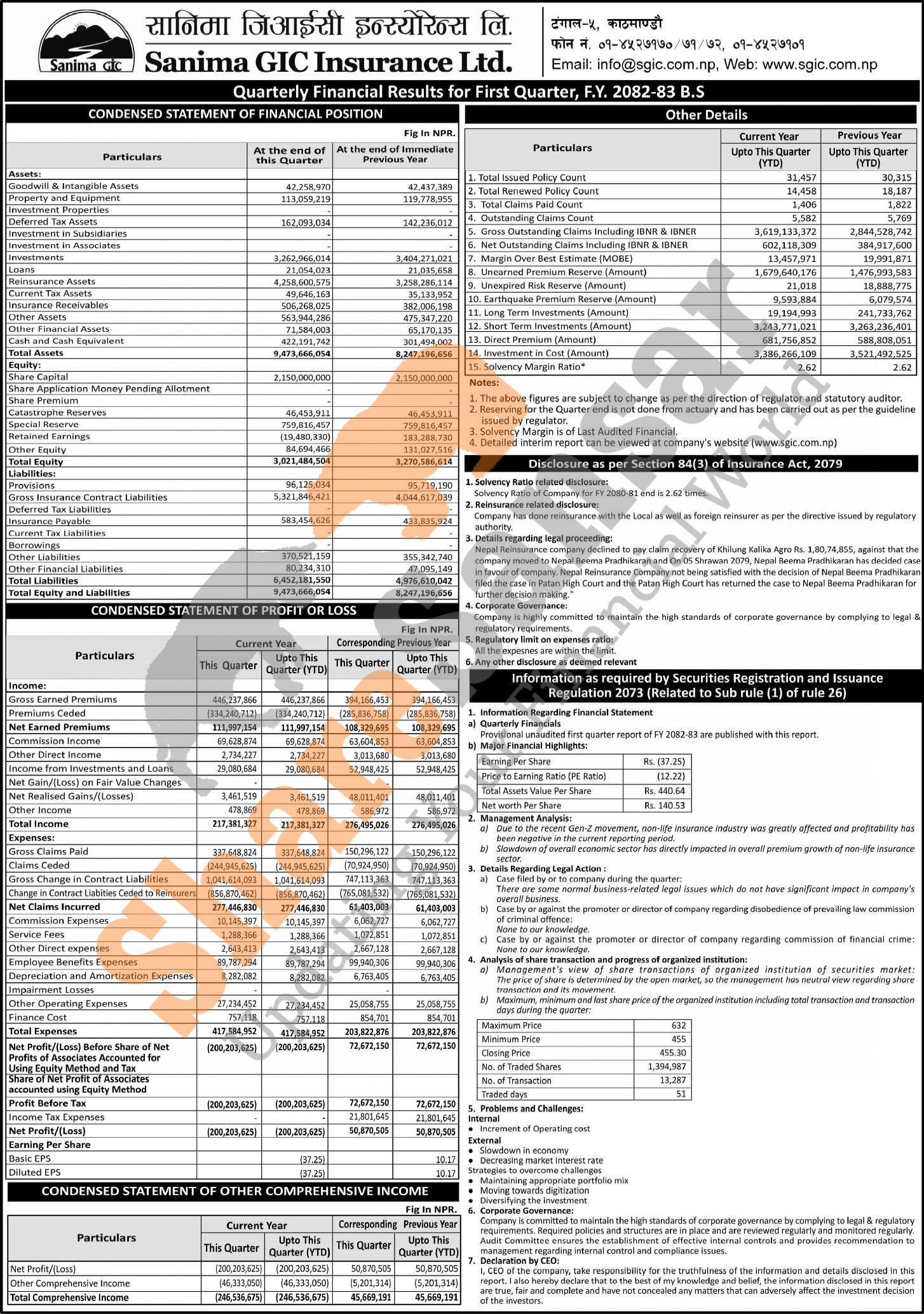 Sanima GIC Insurance Limited has posted a net loss of Rs 200.20 million and published its 1st quarter company analysis of the fiscal year 2082/83.