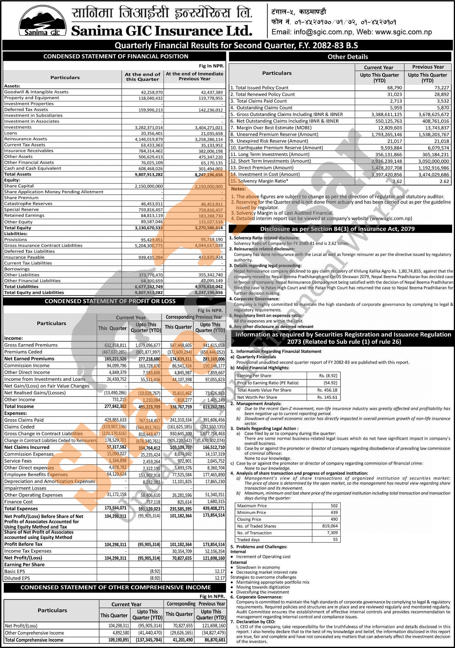 Sanima GIC Insurance Limited has posted a net loss of Rs 95.90 million and published its 2nd quarter company analysis of the fiscal year 2082/83.