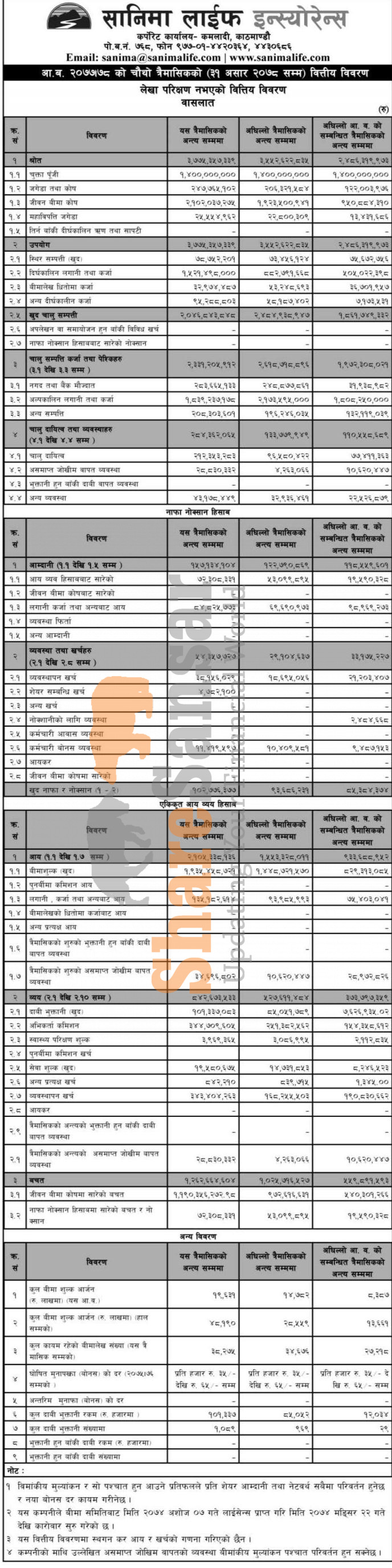 Sanima Life Insurance Limited has posted a net profit of Rs 102.77 million during the 4th quarter of the fiscal year 2077/78.