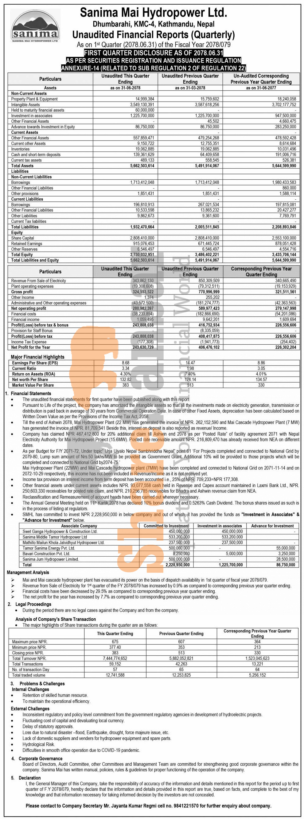 Sanima Mai Hydropower Company Limited has posted a net profit of Rs 243.63 million and published its 1st quarter company analysis of the fiscal year 2078/79.