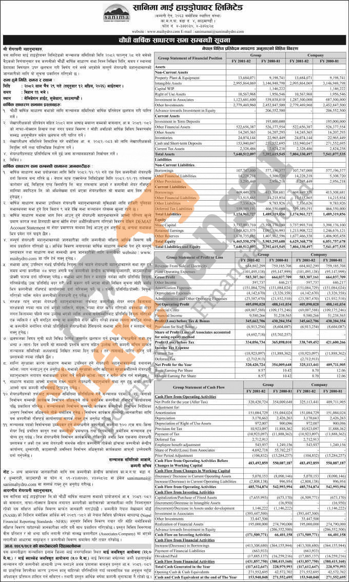 Sanima Mai Hydropower Limited has announced its 14th AGM going to be held on 29th Chaitra, 2082 and published its annual financial statement of the fiscal year 2081/82.