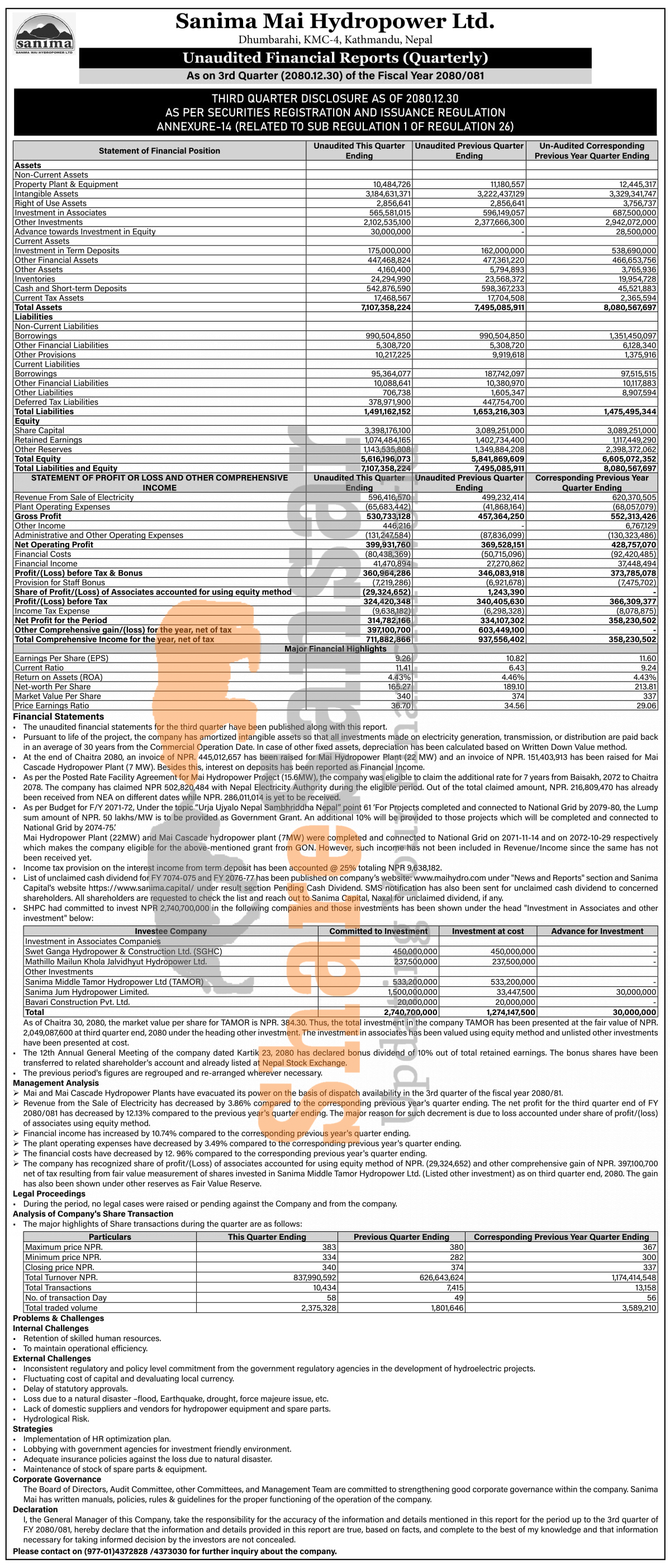 Sanima Mai Hydropower Limited has posted a net profit of Rs 314.78 million and published its 3rd quarter company analysis of the fiscal year 2080/81.