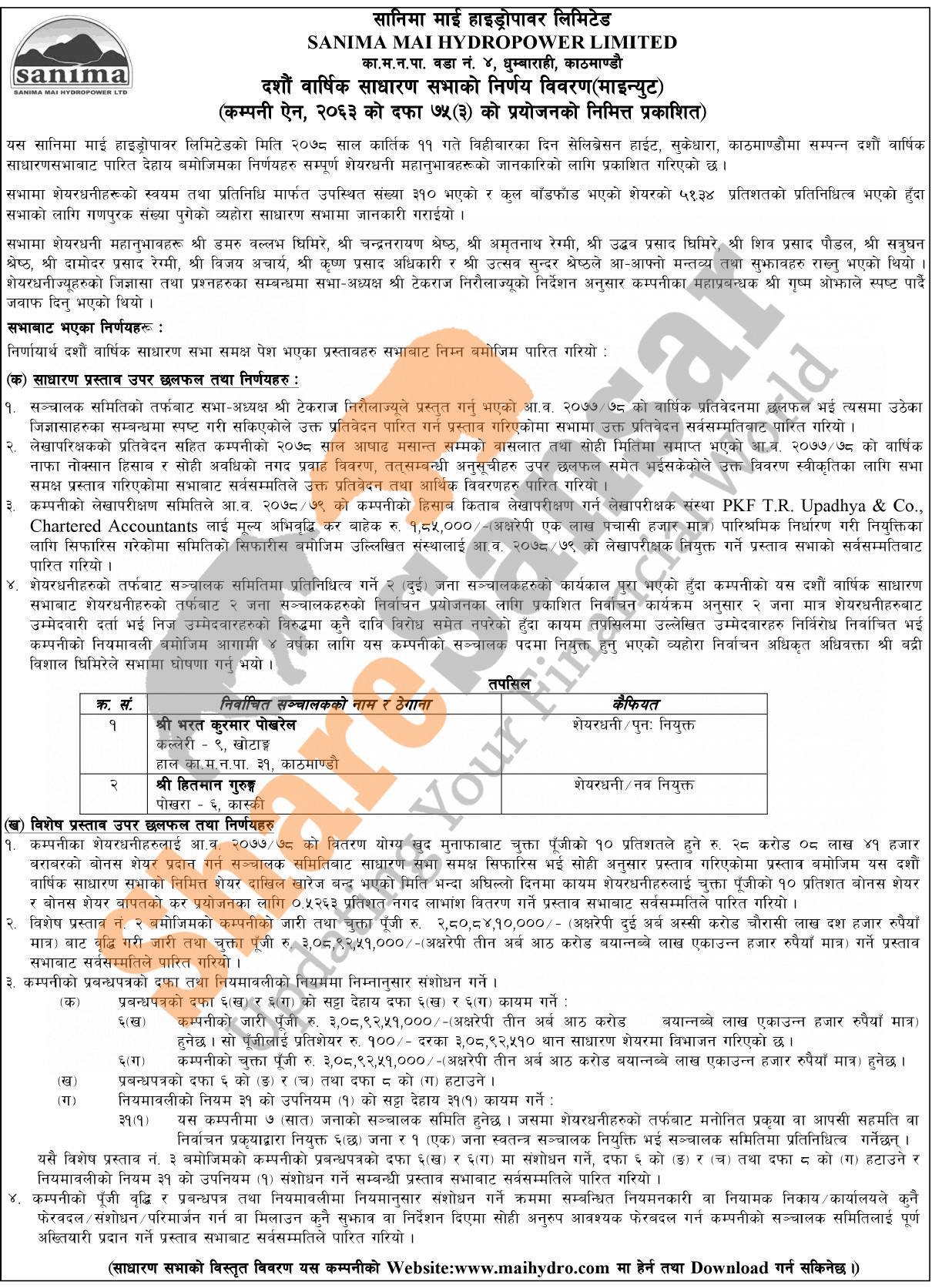 Sanima Mai Hydropower Limited has published the minutes of its 10th AGM.