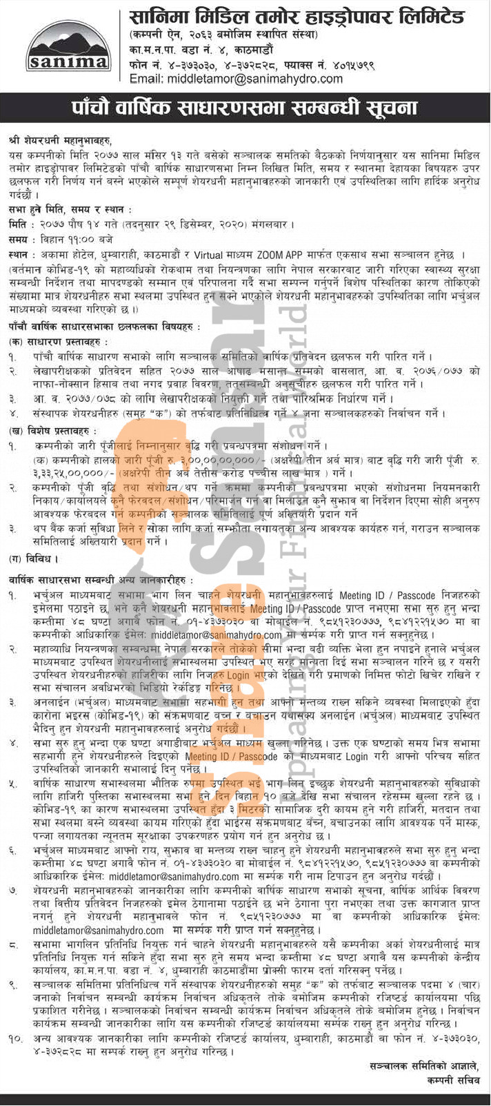 Sanima Middle Tamor Hydropower Limited has announced its 5th AGM going to be held on 14th Poush, 2077.