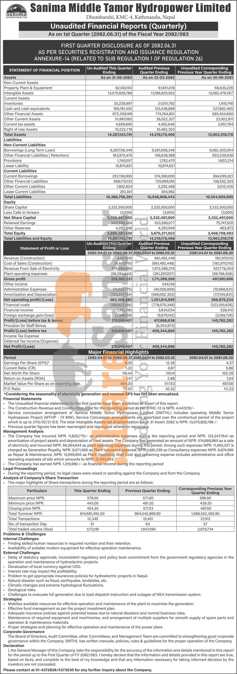 Sanima Middle Tamor Hydropower Limited has posted a net profit of Rs 210.01 million and published its 1st quarter company analysis of the fiscal year 2082/83.