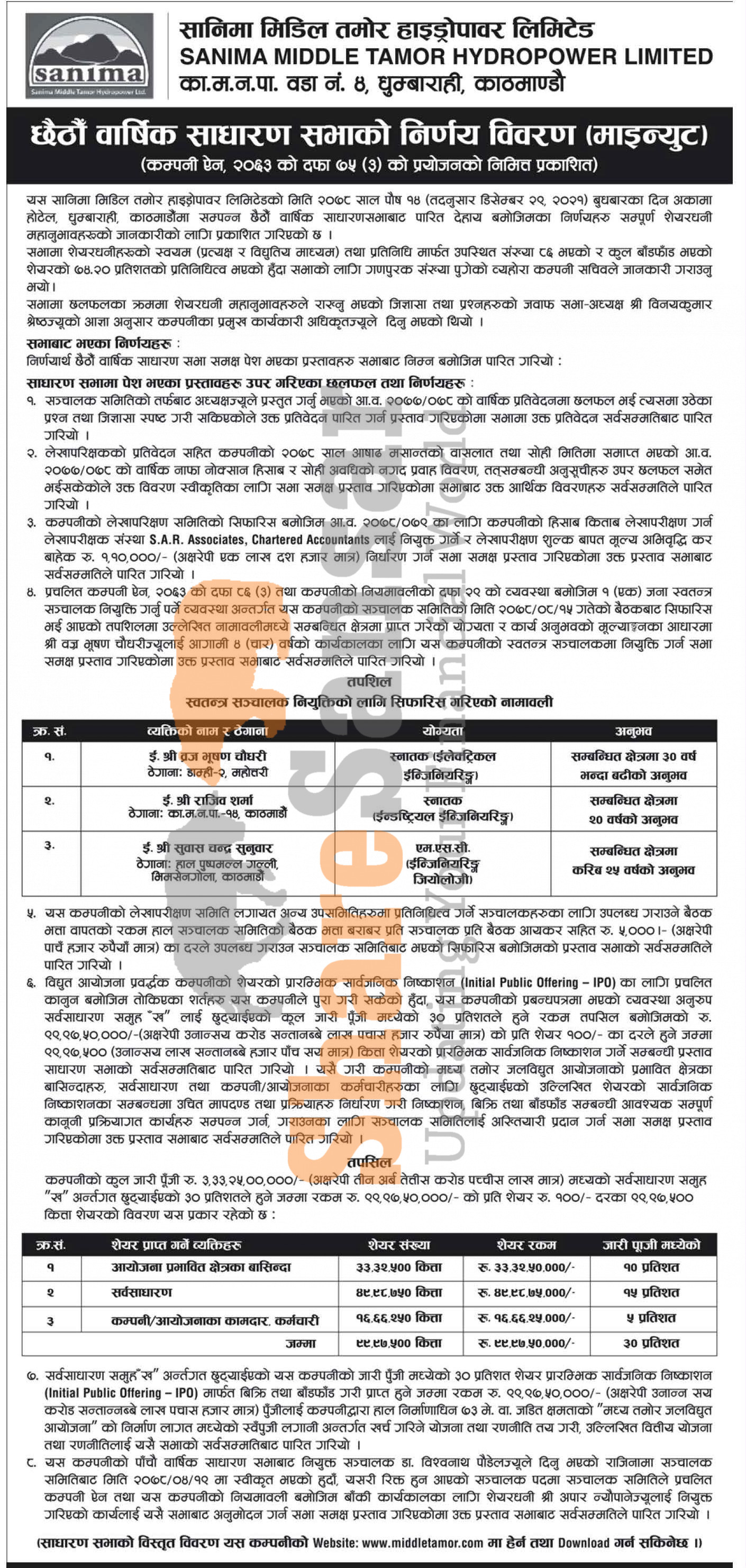 Sanima Middle Tamor Hydropower Limited has published the minutes of its 6th Annual General Meeting (AGM).
