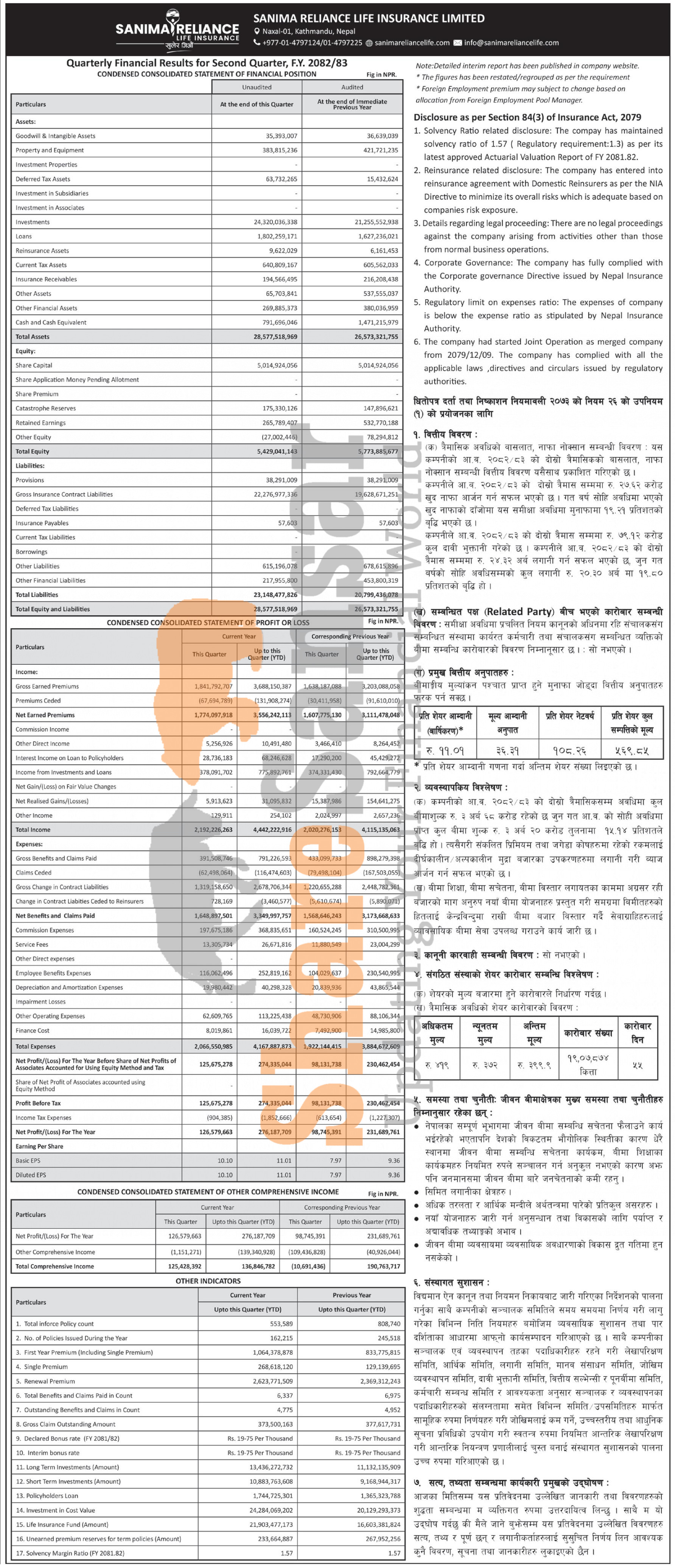 Sanima Reliance Life Insurance Limited has posted a net profit of Rs 276.18 million and published its 2nd quarter company analysis of the fiscal year 2082/83.