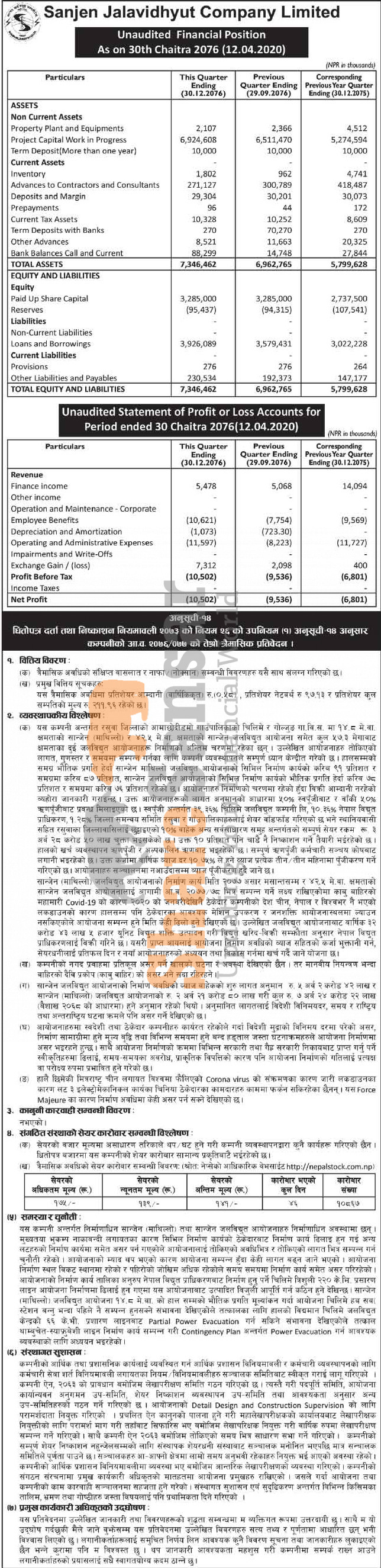 Sanjen Jalavidhyut Company Limited has posted a net loss of Rs 10.5 million and published its 3rd quarter company analysis of the fiscal year 2076/77.