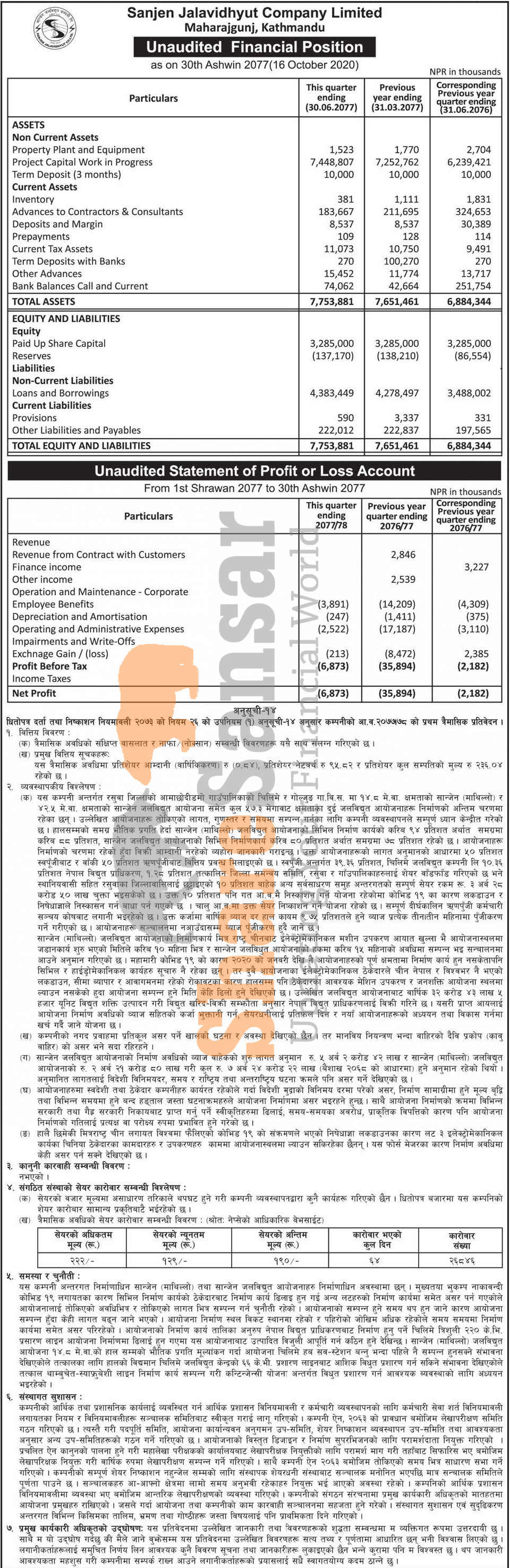 Sanjen Jalavidhyut Company Limited has posted a net loss of Rs 6.87 million and published its 1st quarter company analysis of the fiscal year 2077/78.