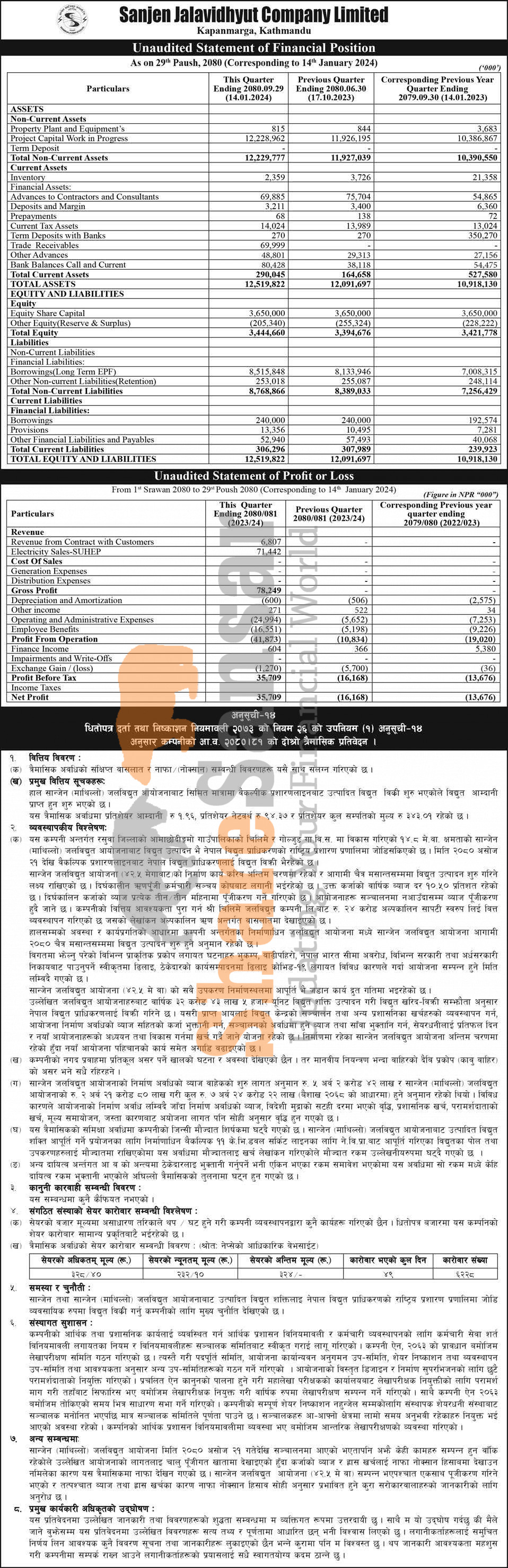 Sanjen Jalavidhyut Company Limited has posted a net profit of Rs 35.70 million and published its 2nd quarter company analysis of the fiscal year 2080/81.
