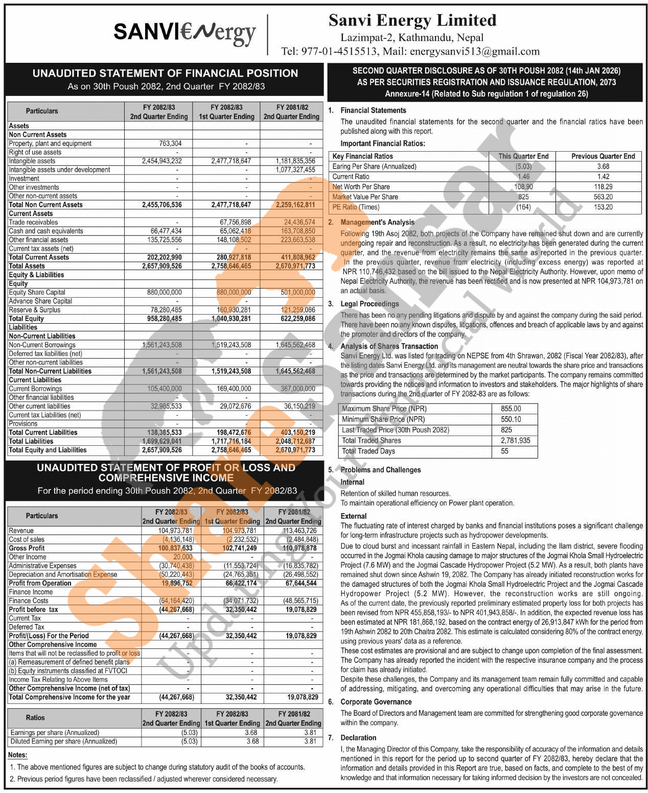 Sanvi Energy Limited has posted a net loss of Rs 44.26 million and published its 2nd quarter company analysis of the fiscal year 2082/83.