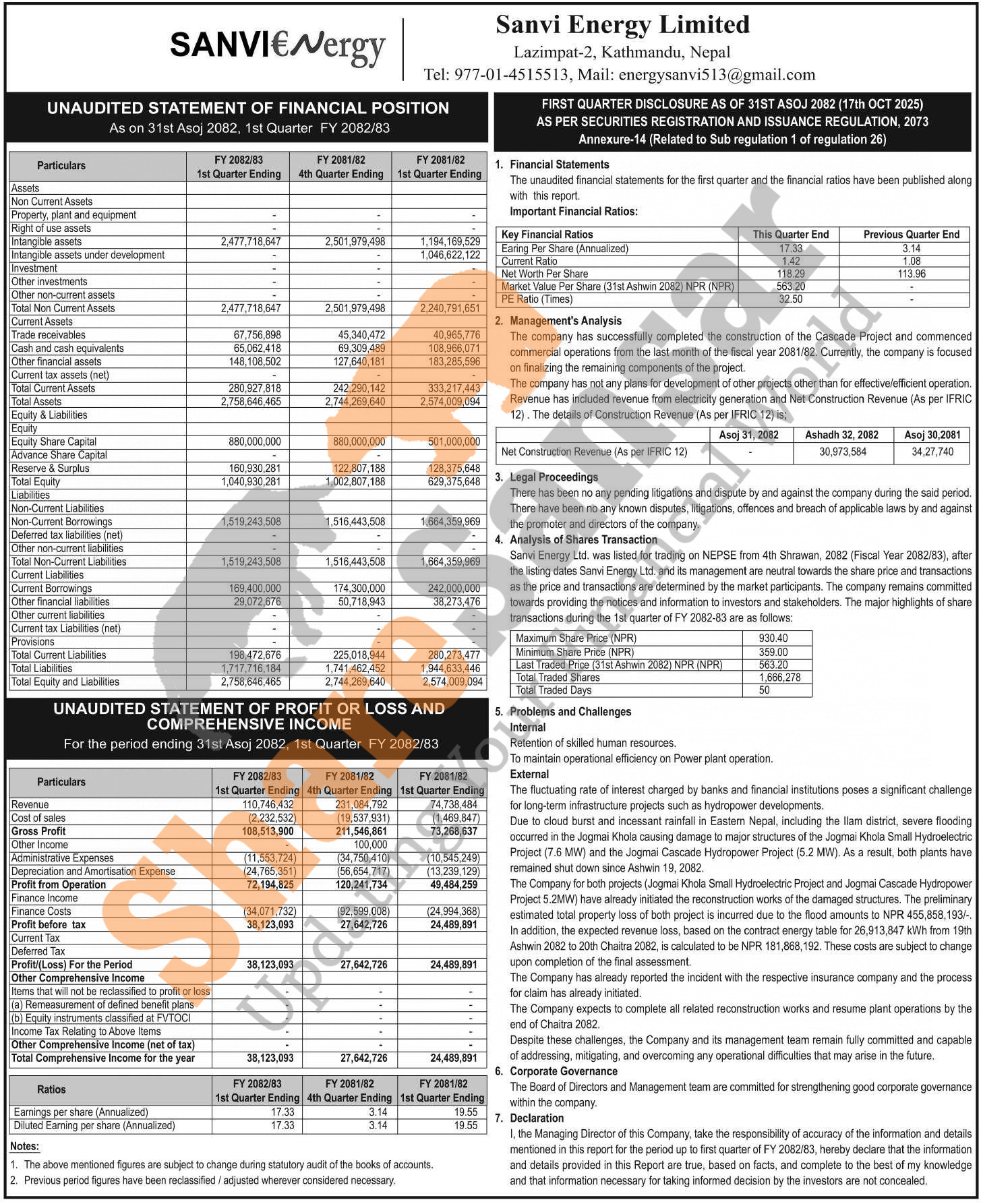 Sanvi Energy Limited has posted a net profit of Rs 38.12 million and published its 1st quarter company analysis of the fiscal year 2082/83.