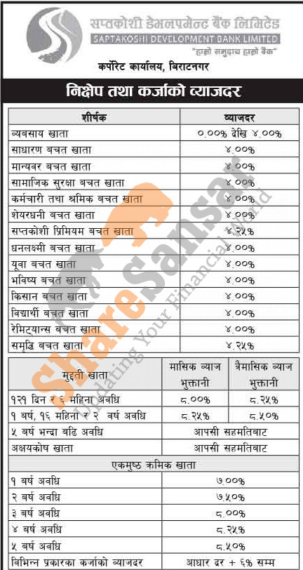 Saptakoahi Development Bank Limited has published a notice regarding the new interest rate for its deposit and loan products and its effective from 6th Bhadra, 2077.
