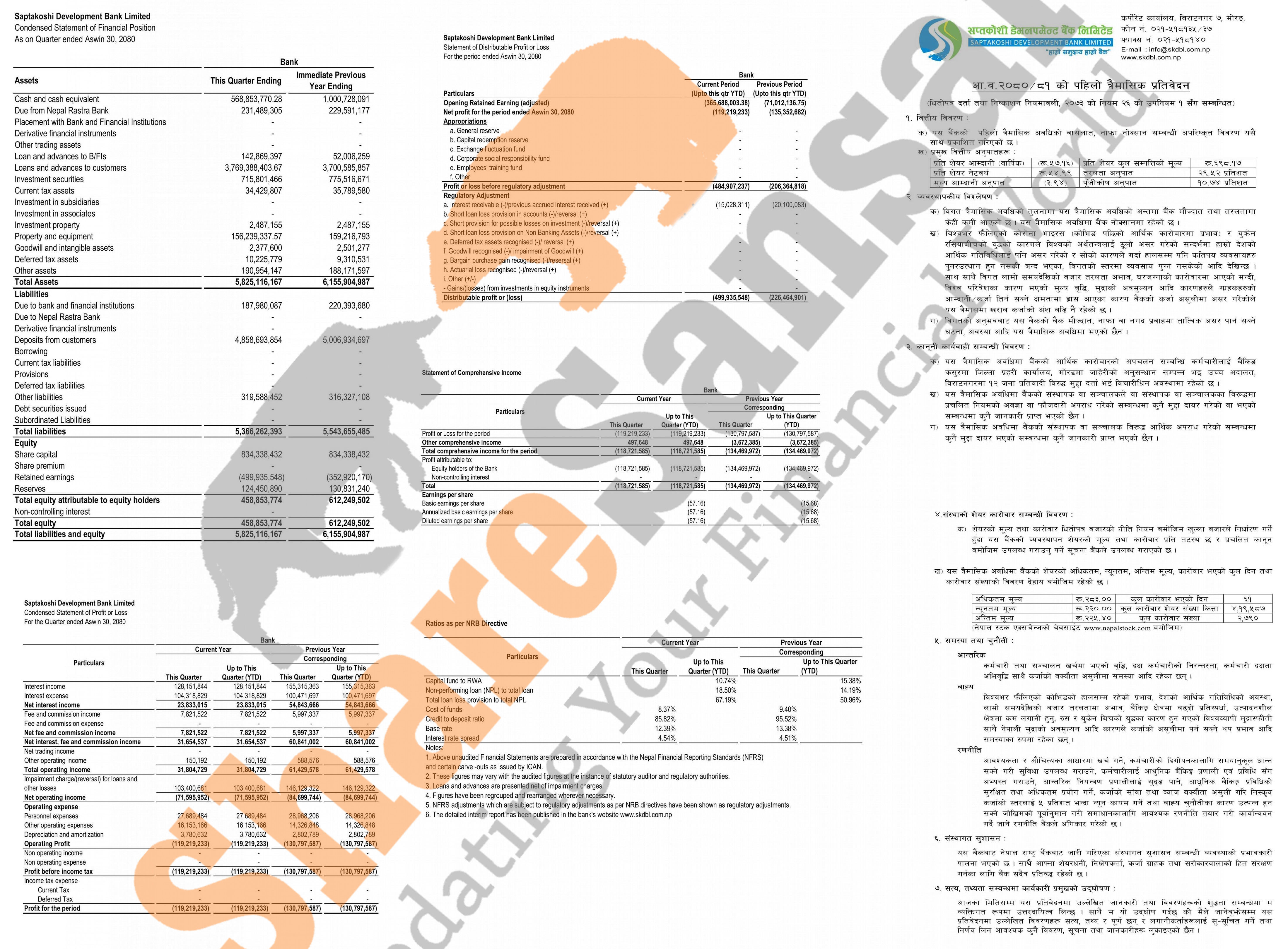 Saptakoshi Development Bank Limited has posted a net loss of Rs 119.21 million and published its 1st quarter company analysis of the fiscal year 2080/81.