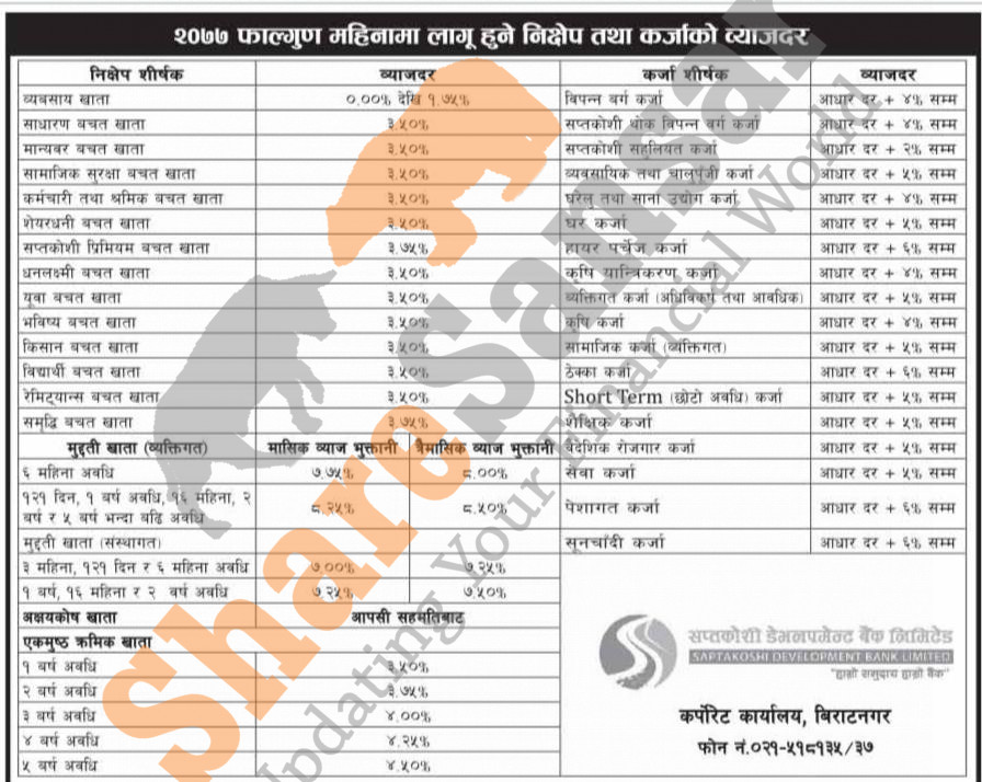 Saptakoshi Development Bank Limited has published a notice regarding the new interest rate for deposit and loan products and it's effective from 1st Falgun, 2077.