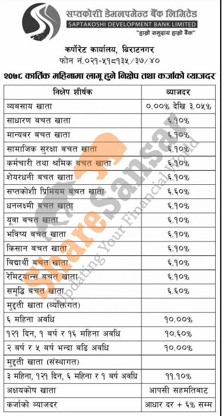 Saptakoshi Development Bank Limited has published a notice regarding the new interest rate for deposit and loan products and it's effective from 1st Kartik, 2078.