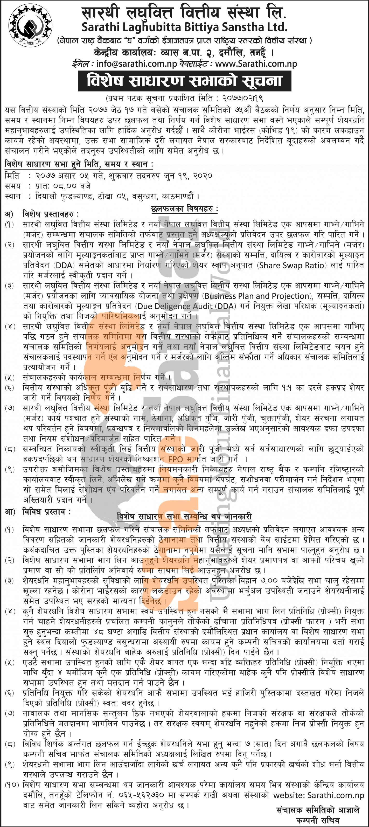 Sarathi Laghubitta Bittiya Sanstha Limited has announced it's Special General Meeting going to be held on 5th Ashad, 2077.
