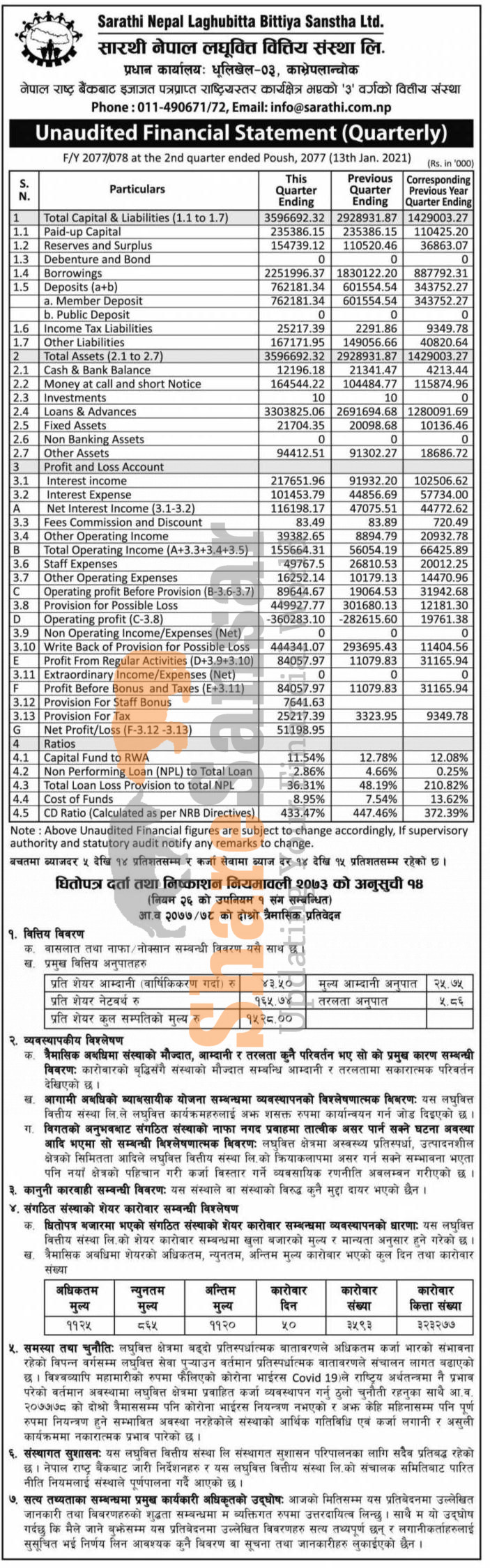 Sarathi Nepal Laghubitta Bittiya Sanstha Limited has posted a net profit of Rs 51.19 million and published its 2nd quarter company analysis of the fiscal year 2077/78.