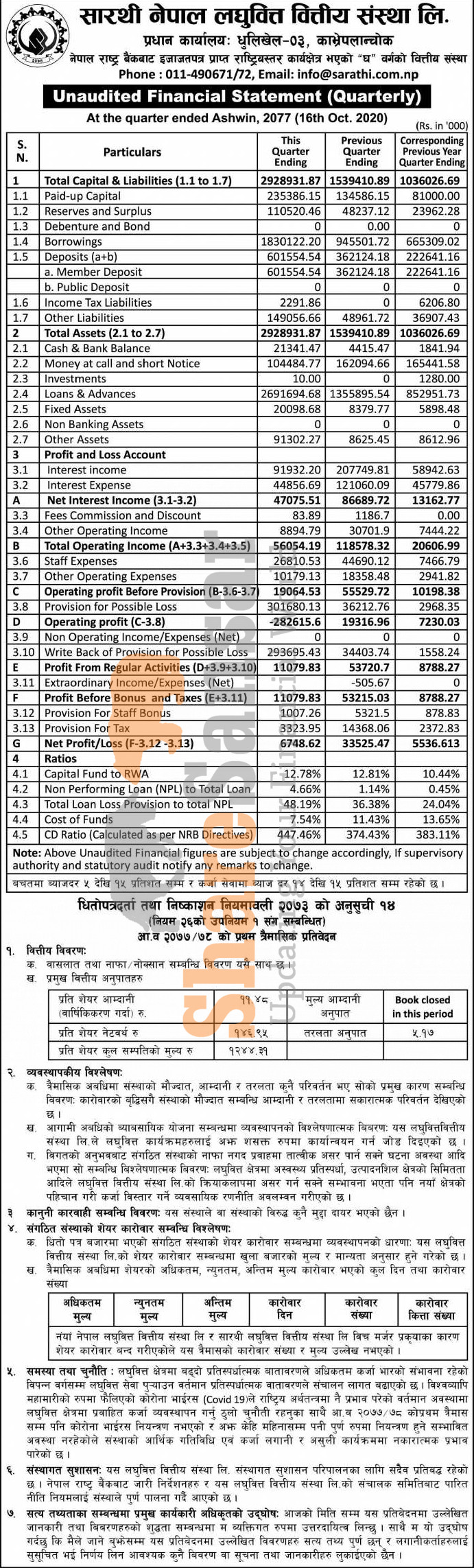 Sarathi Nepal Laghubitta Bittiya Sanstha Limited has posted a net profit of Rs 6.74 million and published its 1st quarter company analysis of the fiscal year 2077/78.