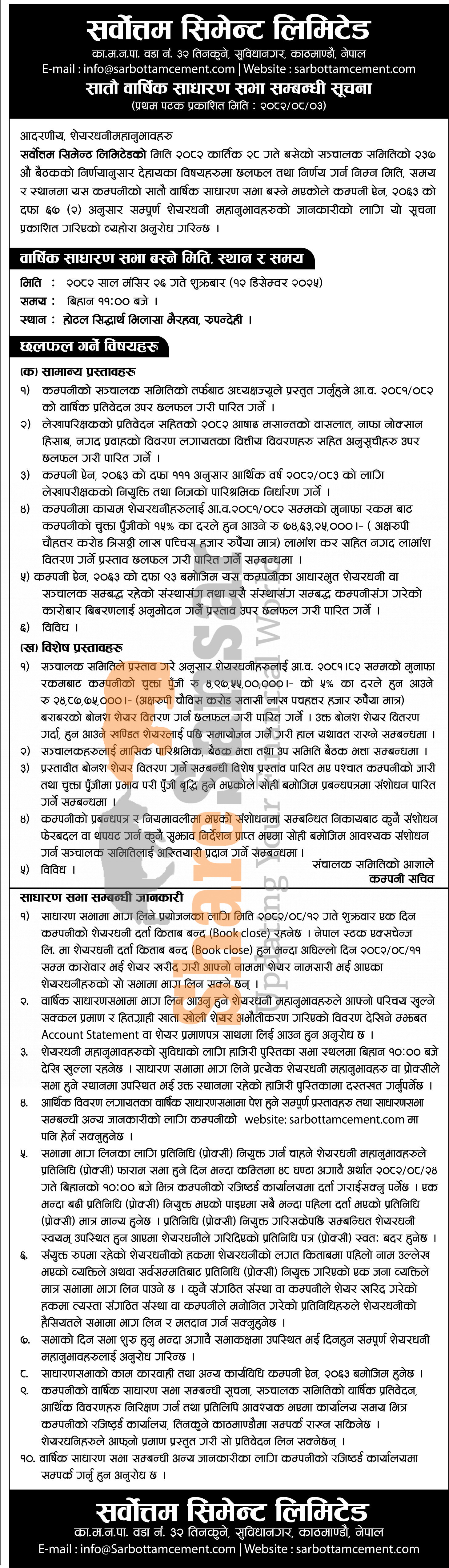 Sarbottam Cement Limited has announced its 7th AGM going to be held on 26th Mangsir, 2082.