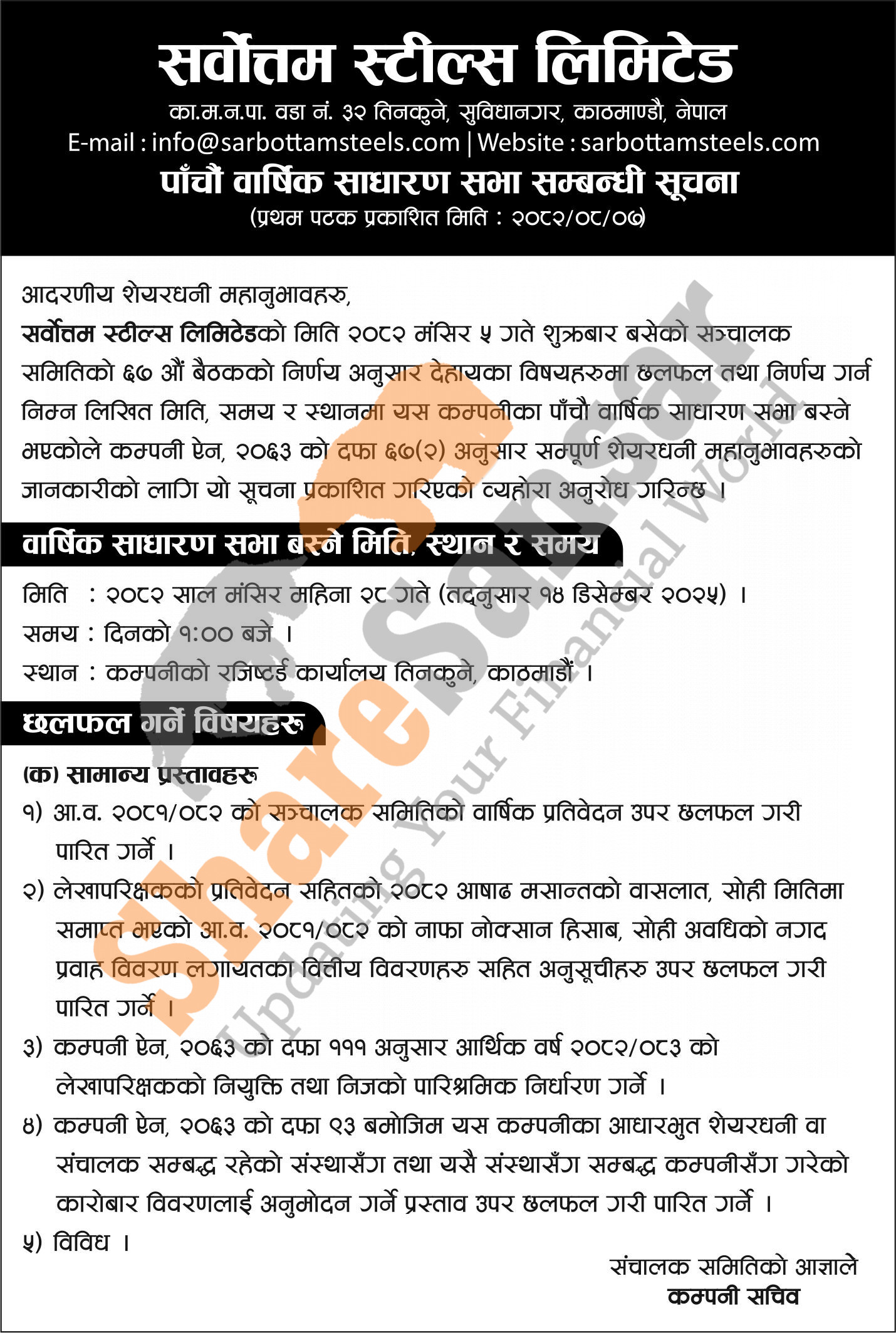 Sarbottam Steel Limited has announced its 5th AGM going to be held on 28th Mangsir, 2082.