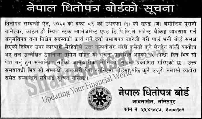 SEBON has published a notice regarding stoppage of work of Merchant Banker an depository participant of stock management to the general public in common interest.