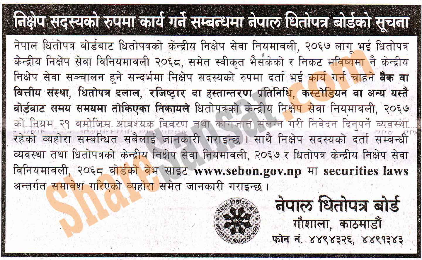SEBON has published a notice to eligible institutions to work as Depository Participants.