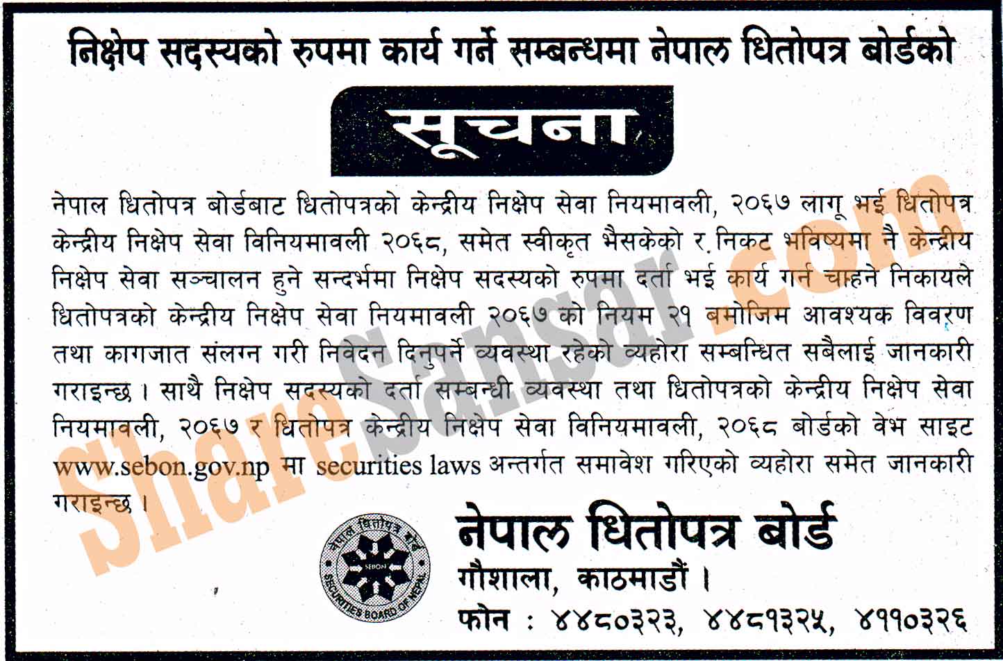 Securities Board of Nepal (SEBON) has published a notice regarding opening of application for depositary participant.