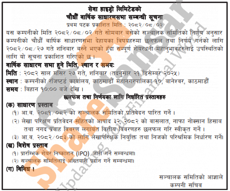 Sewa Hydro Limited has announced its 14th AGM going to be held on 27th Mangsir, 2082.
