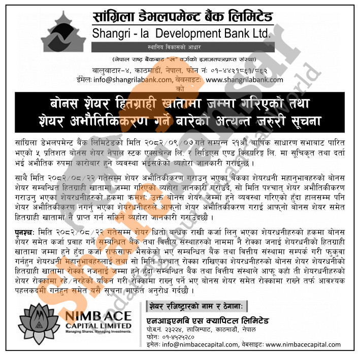 Shangri-la Development Bank Limited has distributed 5% bonus share directly to DEMAT accounts and urged its shareholders to dematerialize their shares.