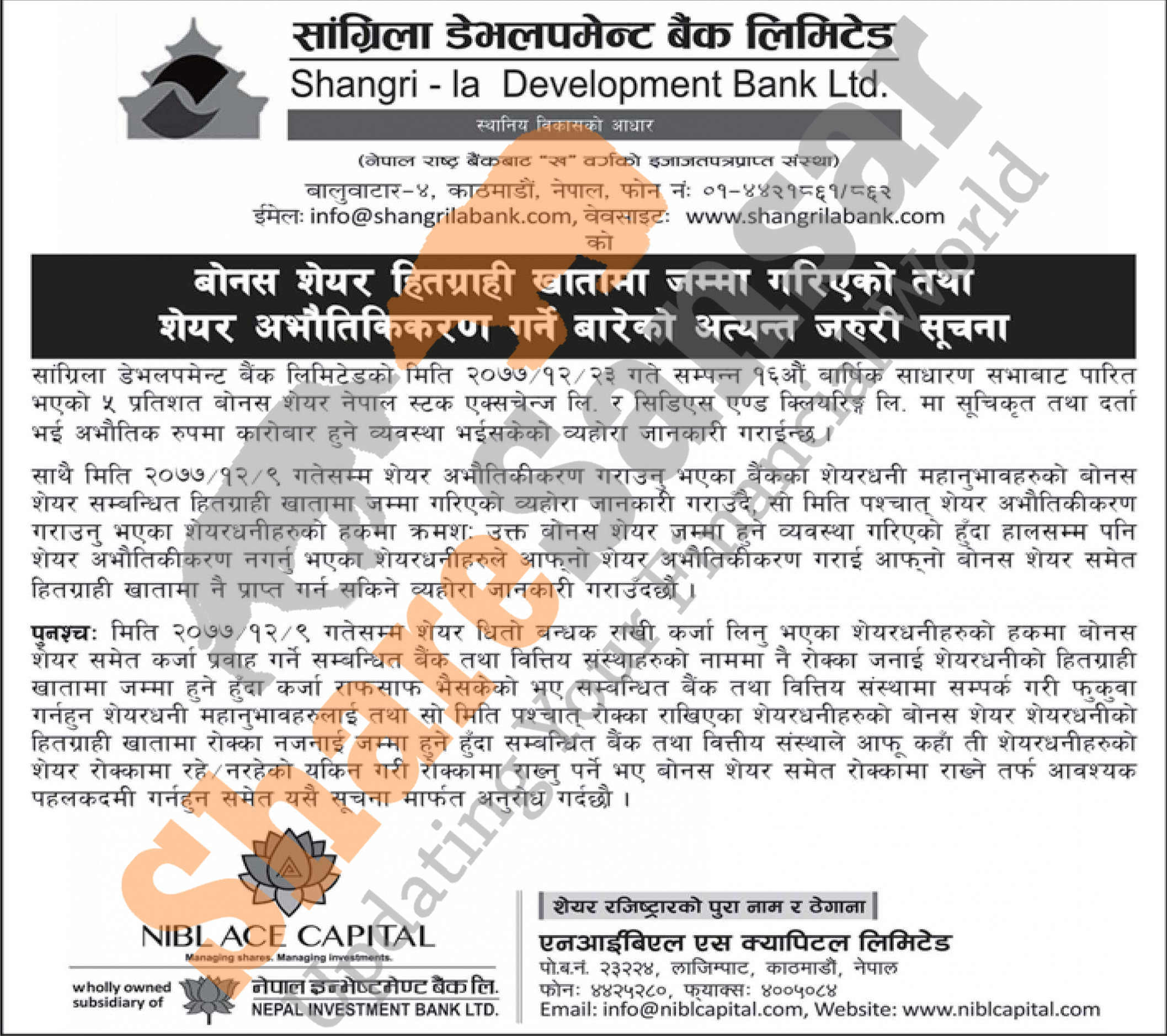 Shangri-la Development Bank Limited has distributed 5% bonus shares directly to DEMAT accounts of its shareholders and has urged to dematerialize their shares.