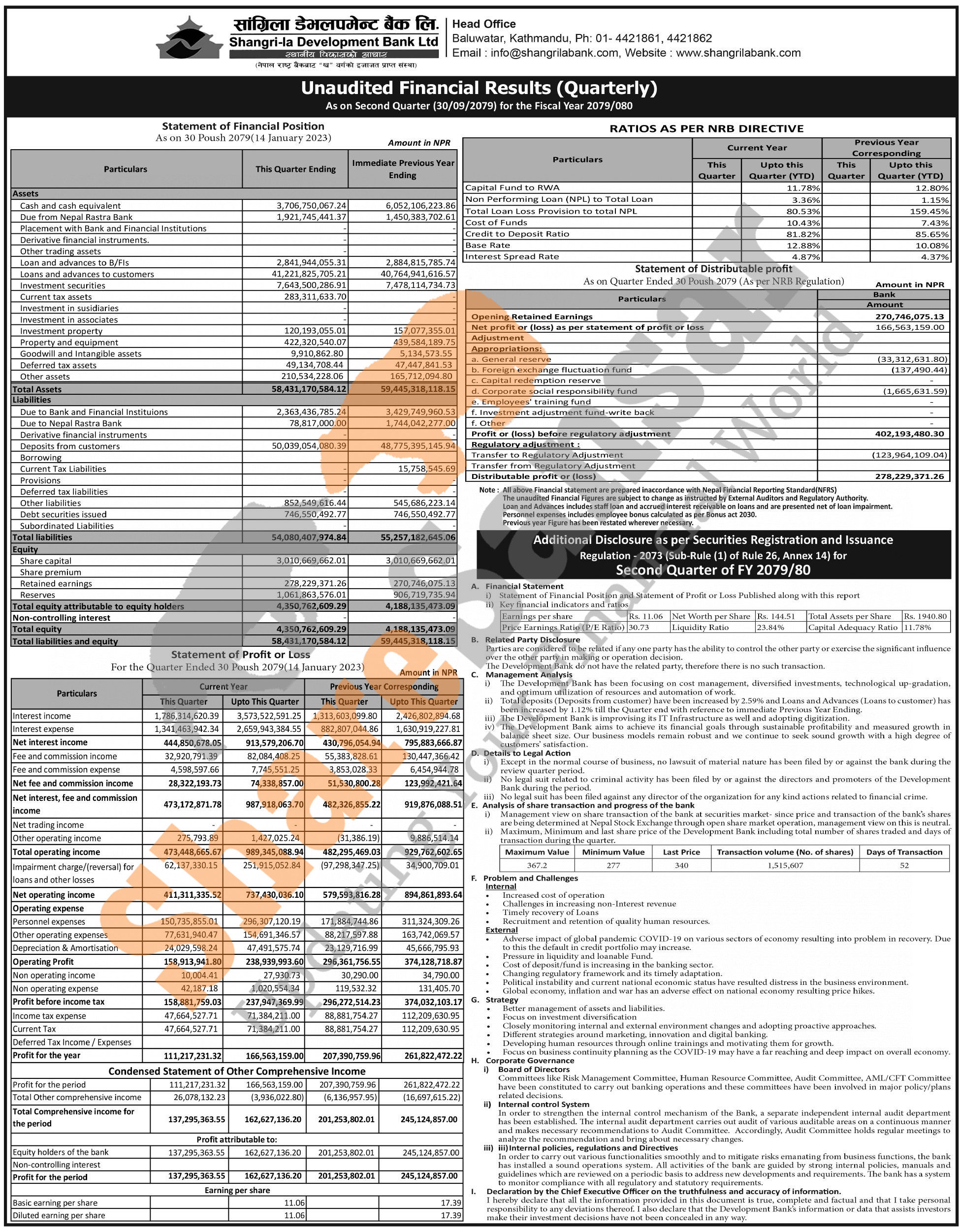 Shangri-la Development Bank Limited has posted a net profit of Rs 166.56 million and published its 2nd quarter company analysis of the fiscal year 2079/80.