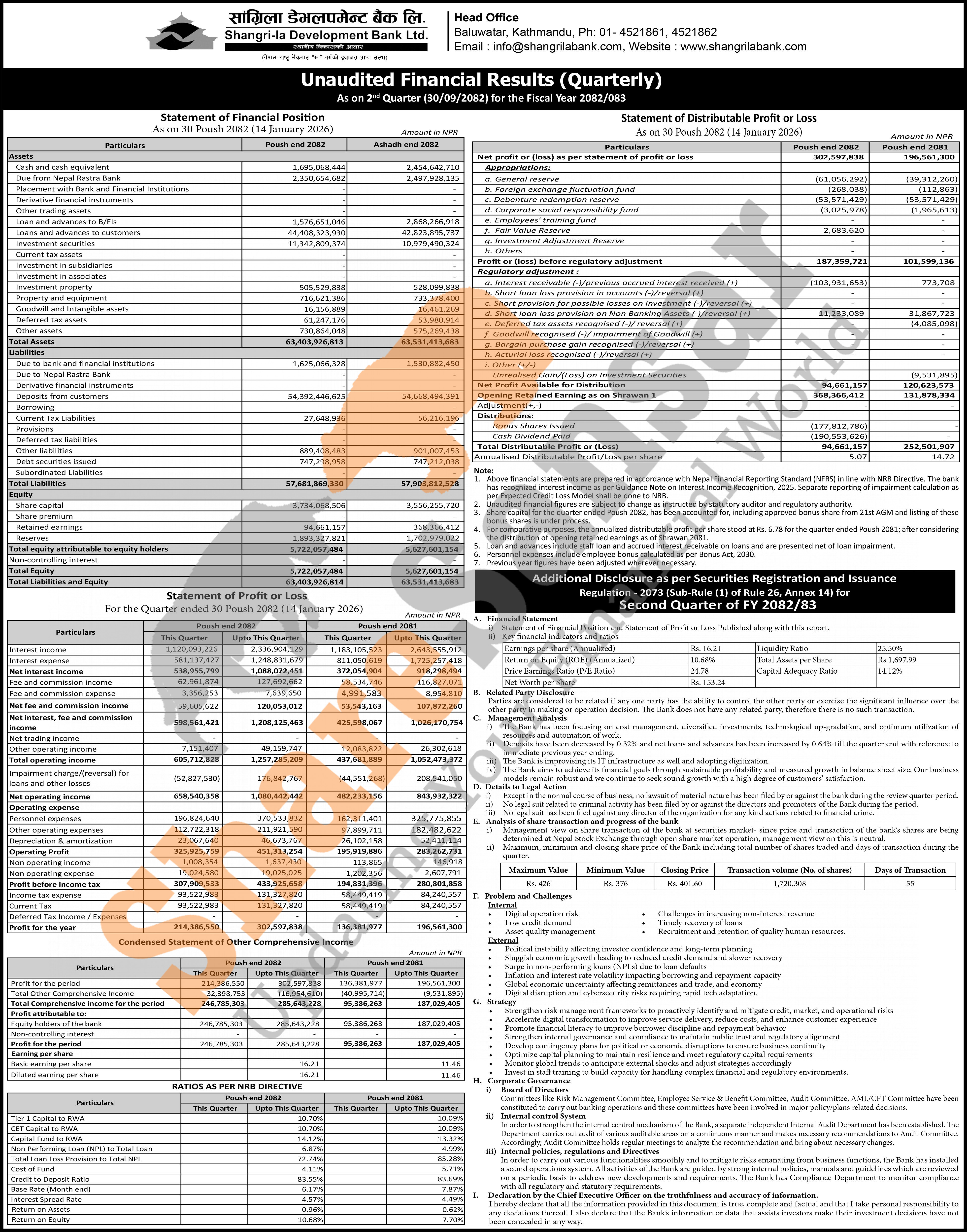 Shangri-la Development Bank Limited has posted a net profit of Rs 302.59 million and published its 2nd quarter company analysis of the fiscal year 2082/83.
