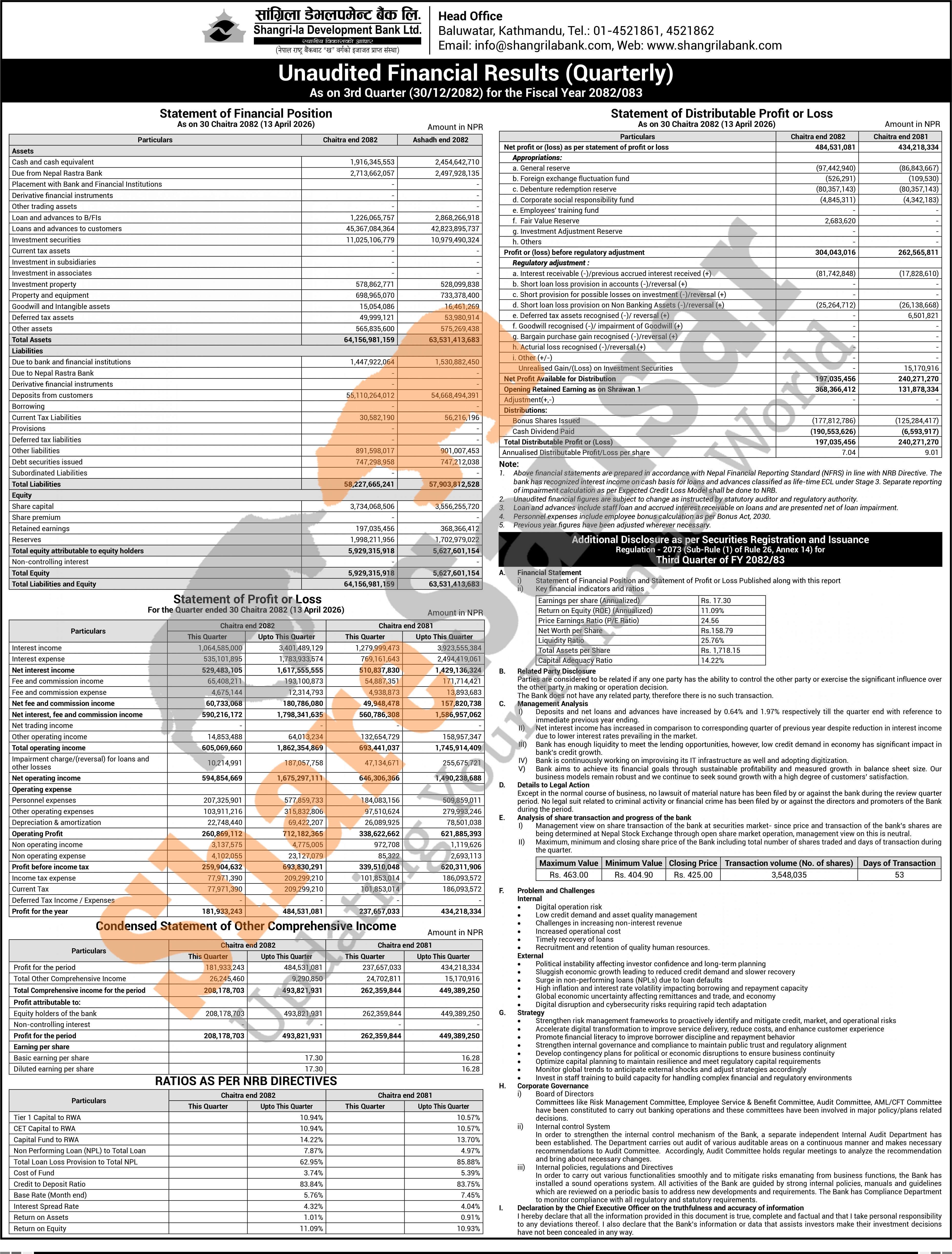 Shangri-la Development Bank Limited has posted a net profit of Rs 484.53 million and published its 3rd quarter company analysis of the fiscal year 2082/83.