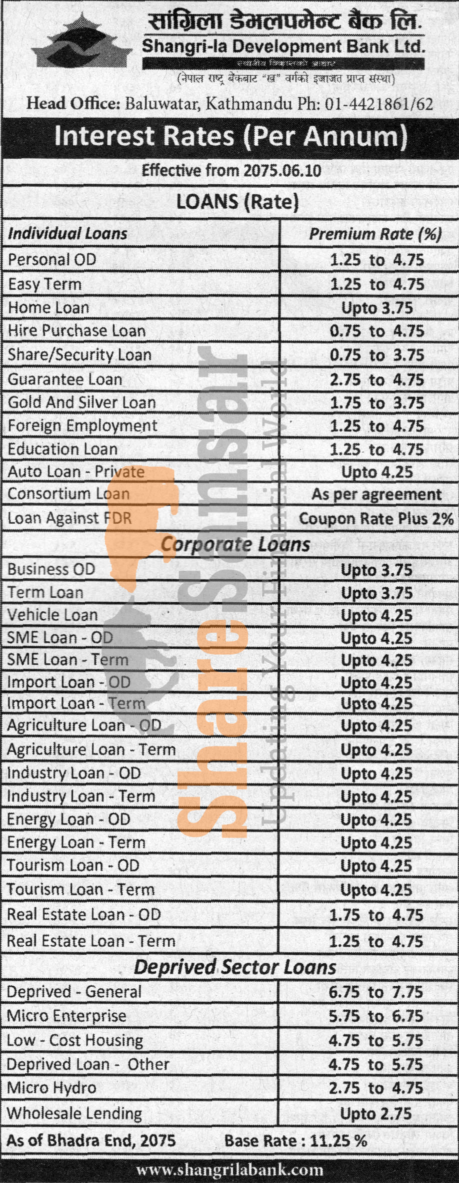 Shangri-la Development Bank Limited has published a notice regarding new interest rate and its effective from 10th ashwin, 2075.