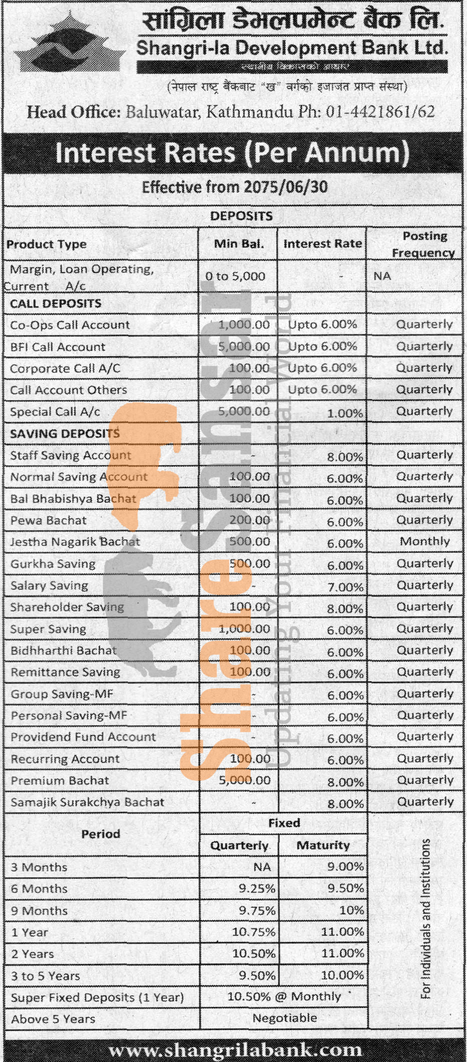 Shangri-la Development Bank Limited has published a notice regarding new interest rate and its effective from 30th Ashwin, 2075.