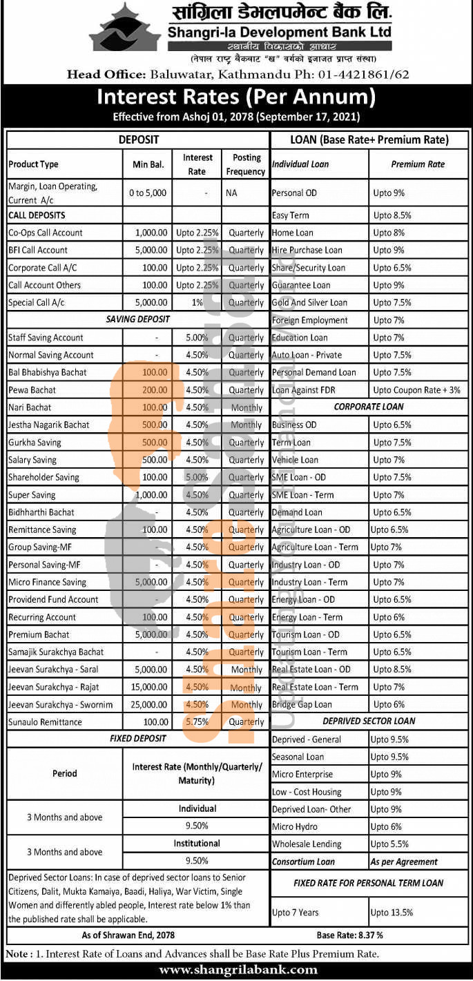 Shangri-la Development Bank Limited has published a notice regarding the new interest rate for deposit and loan products and it's effective from 1st Ashwin, 2078.